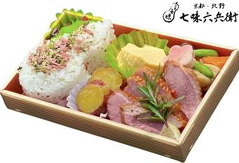 昭和30年より、一子相伝で七味を製造している「七味六兵衛」。六兵衛 京の彩り弁当は、ロゴマークのひょうたん型にかたどったご飯と、鴨ロースに六兵衛スパイスをふり、焼きあげ、彩り良い惣菜とともに詰め合わせた、催事限定販売のお弁当です。