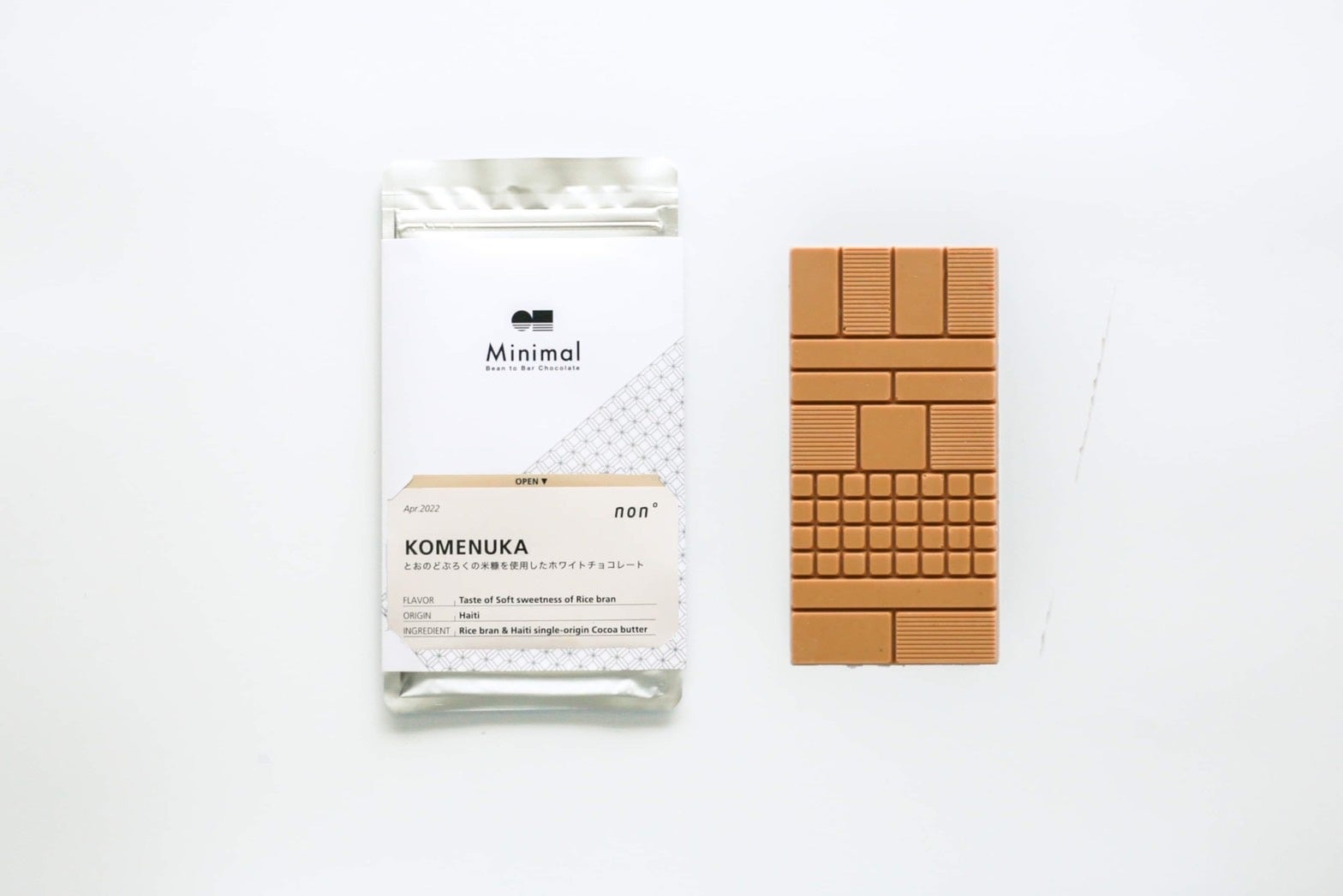 そして今回の出版記念展に合わせて初のお披露目となるのが、米糠のチョコレート。東京・代々木上原にあるチョコレート専門店「Minimal‒BeantoBar Chocolate‒」とのコラボにより実現した。無農薬栽培の遠野一号の米糠を、砂糖の代わりにチョコレートの甘味に用いることで柔らかな甘味のある味わいに仕上げ、米の個性、遠野の土地の味わいが詰まった米糠チョコレートとなった。会場では、とおの屋のどぶろくの米糠を使用したホワイトチョコレート「KOMENUKA」(下写真の上)と、ダークチョコレート「KOMENUKA -FRUITY-」(下写真の下)を販売する。佐々木要太郎さんは最終週の週末6月4日(土)、5日(日)に在廊予定だ。