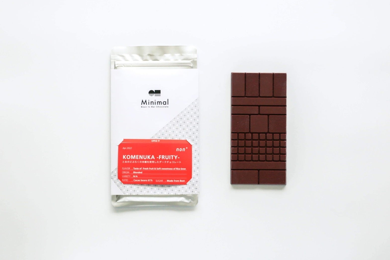 そして今回の出版記念展に合わせて初のお披露目となるのが、米糠のチョコレート。東京・代々木上原にあるチョコレート専門店「Minimal‒BeantoBar Chocolate‒」とのコラボにより実現した。無農薬栽培の遠野一号の米糠を、砂糖の代わりにチョコレートの甘味に用いることで柔らかな甘味のある味わいに仕上げ、米の個性、遠野の土地の味わいが詰まった米糠チョコレートとなった。会場では、とおの屋のどぶろくの米糠を使用したホワイトチョコレート「KOMENUKA」(下写真の上)と、ダークチョコレート「KOMENUKA -FRUITY-」(下写真の下)を販売する。佐々木要太郎さんは最終週の週末6月4日(土)、5日(日)に在廊予定だ。