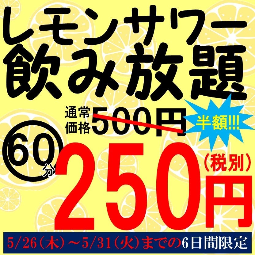 名物レモンサワー飲み放題が通常価格60分500円(税込550円)のところ、5/26(木)~5/31(火)までの6日間日間、60分250円(税込275円)でお楽しみいただけるキャンペーンを行います。