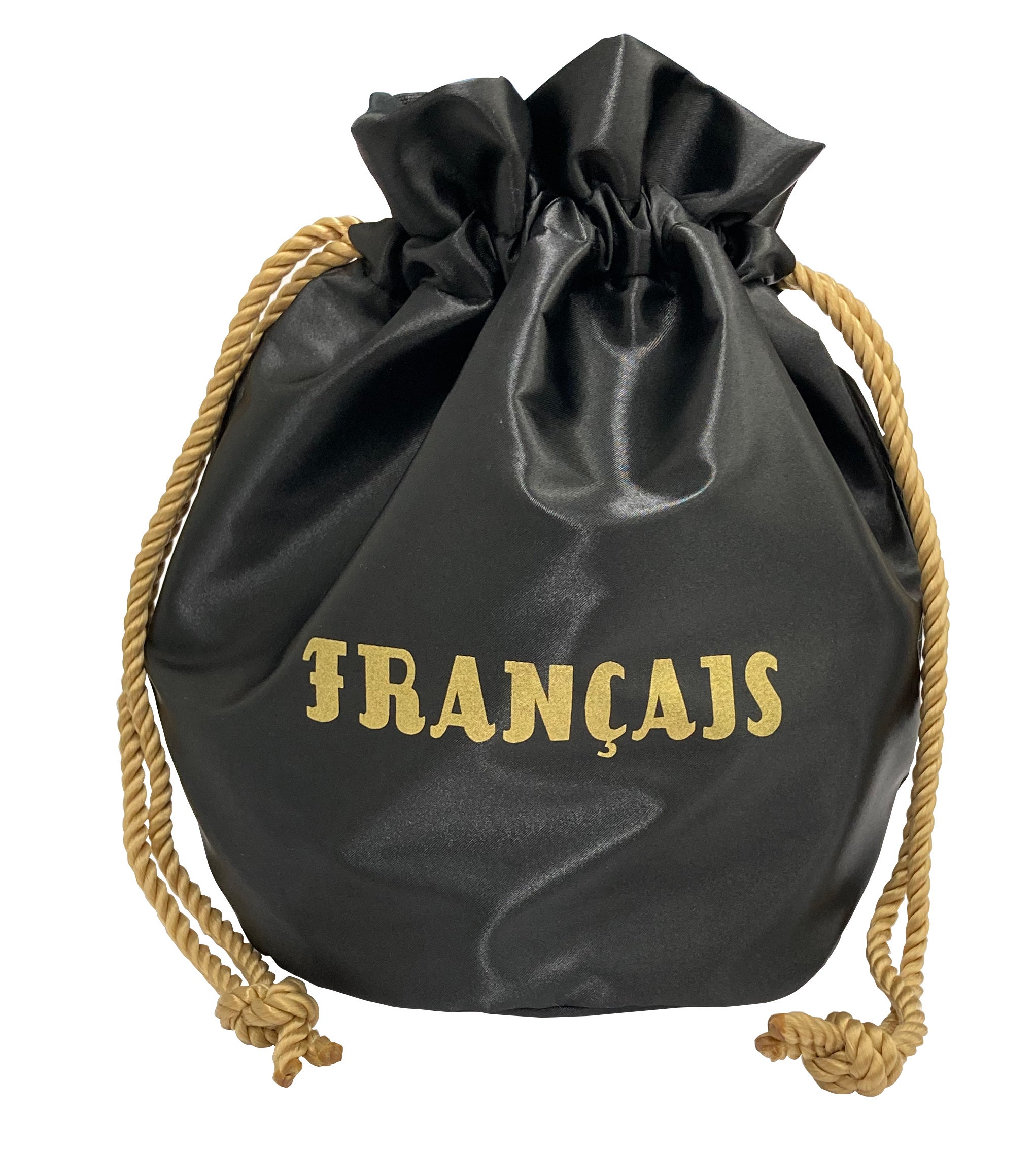 ブラックの色が美しく映えるサテン生地の巾着ポーチです。上品でシンプルな普段使いしやすいデザインです。