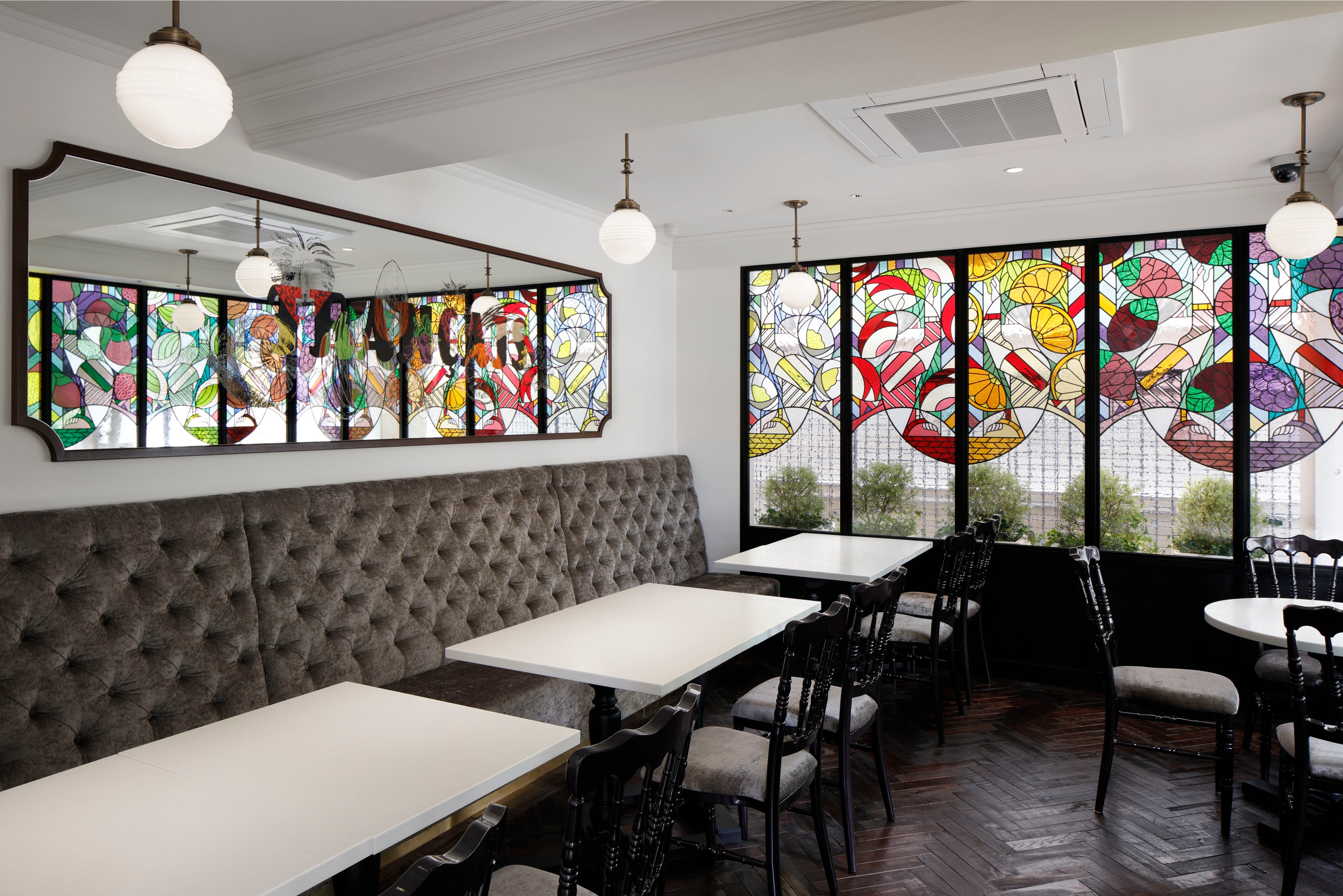 その木漏れ日は、職人によって一枚一枚つなぎ合わされたステンドグラスに彩られ、空間をあざやかに光で満たします。そして緩やかに回廊をめぐり、商品をやさしく包み込みます。”降りそそぐ光で果実が育つ”そんなうれしさであふれるお店です。