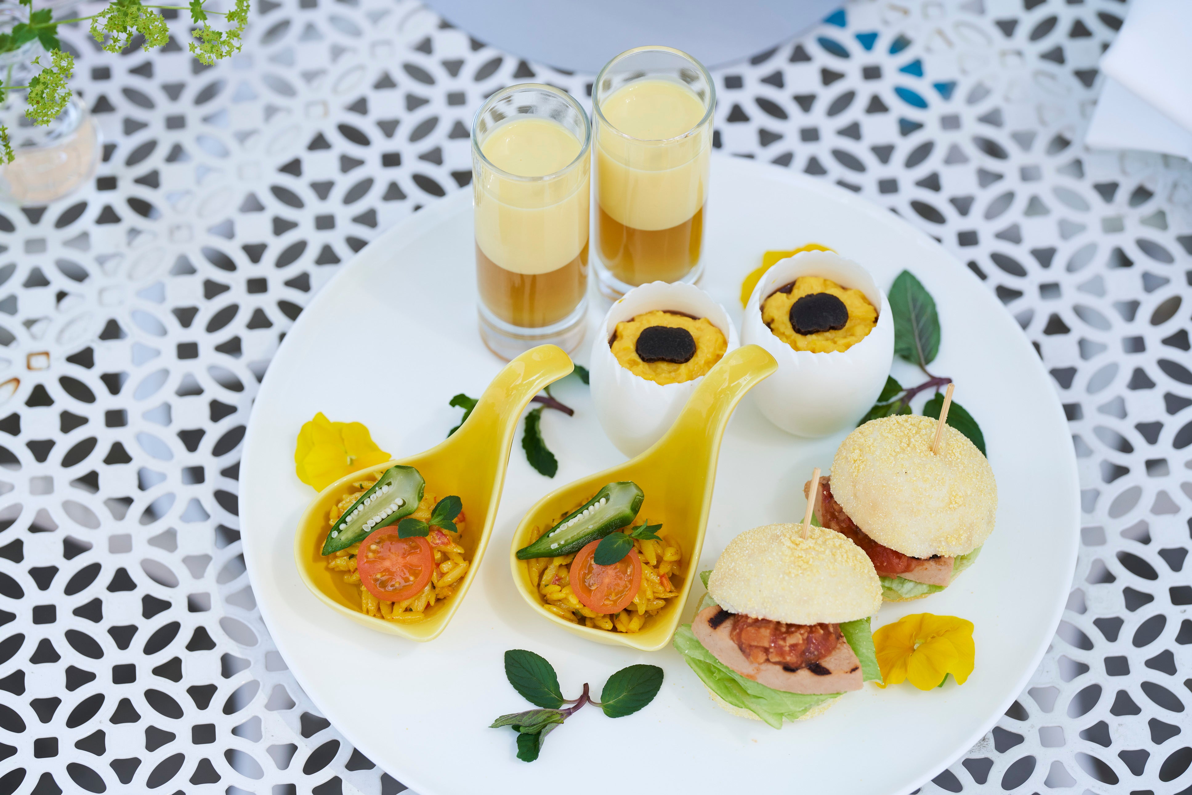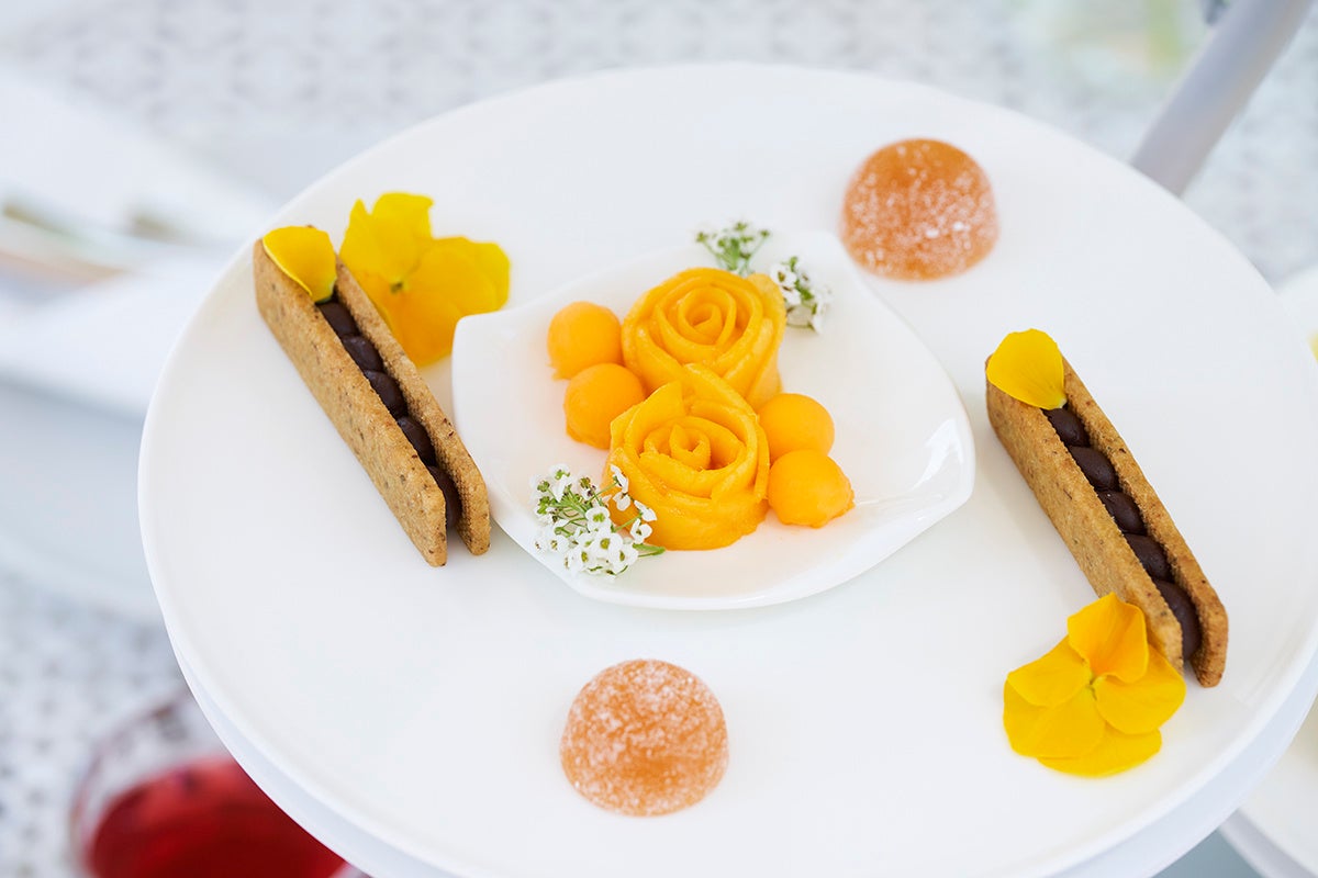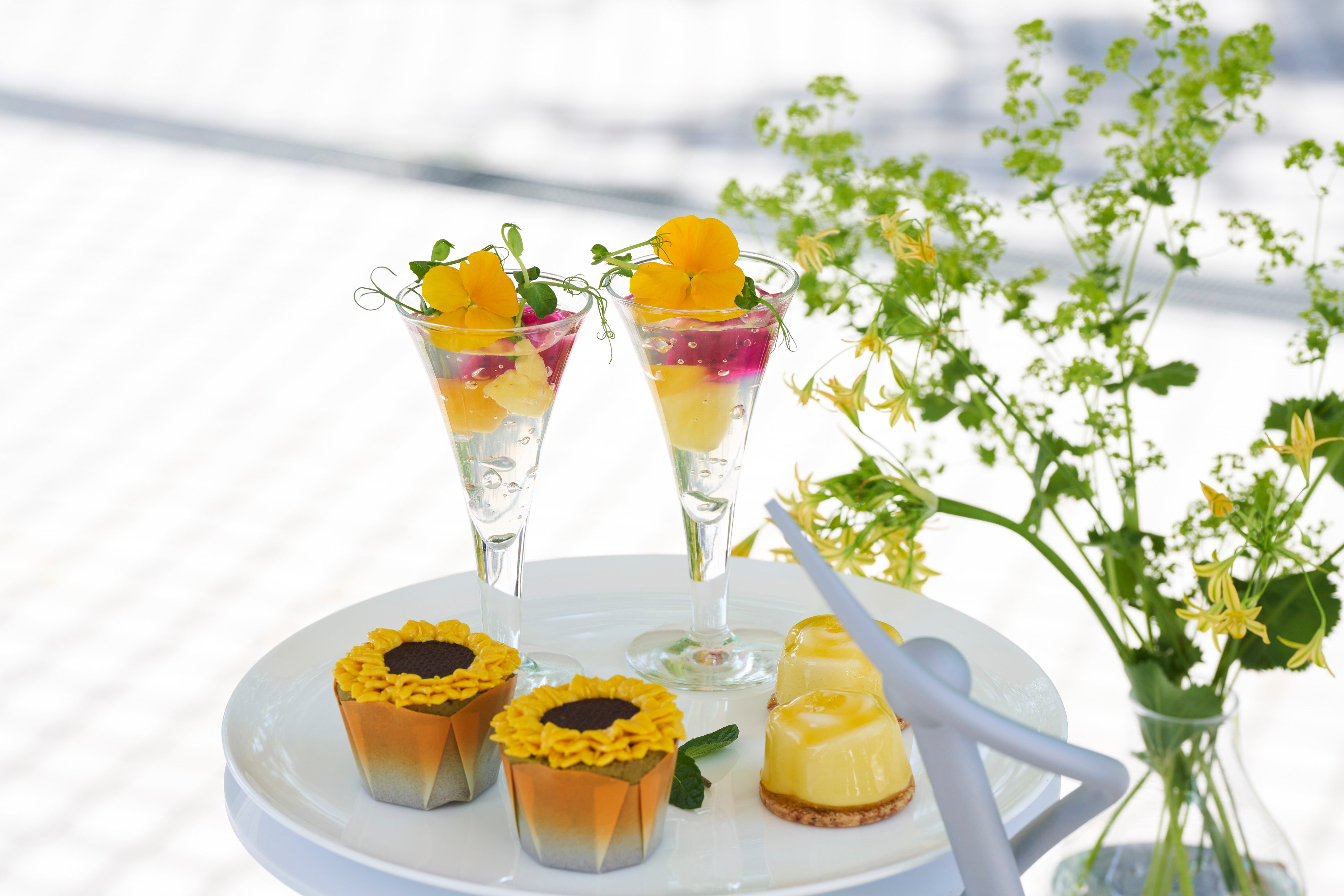 旬のフルーツや野菜、植物由来の食材のみでも満足感のある味わいと食べ応えのあるヴィーガンアフタヌーンティーも、この夏新たな装いでご用意。サマーフルーツを贅沢に使い、爽やかなイエローに仕立てました。スイーツには、ひまわりに見立てた塩レモンのカップケーキ、ミントを使った爽やかなトロピカルフルーツのジュレなど、夏ならではのスイーツのほか、薔薇を模したマンゴーとメロンのカットフルーツなど9品を揃えています。また、セイボリーには、トリュフの香るオムシチューにソイミートボールを忍ばせた一品や、ココナッツ香るマイルドでクリーミーな冷製のコーンスープなど、4品を存分にお楽しみいただけます。