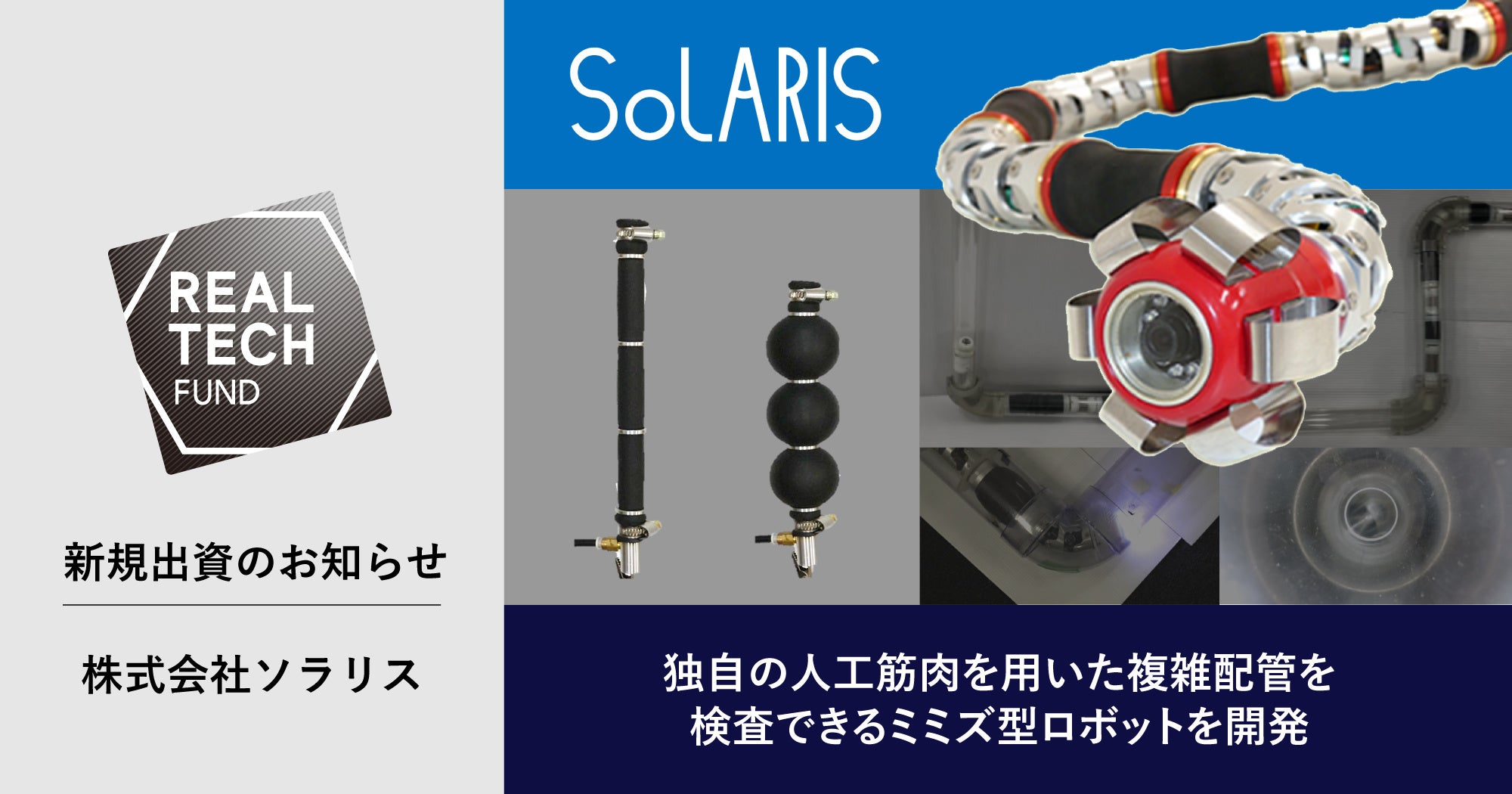 食品やエネルギー、ガスなどの生活に必須なインフラを次世代にまで安定的に提供し続けるべく、リアルテックホールディングス株式会社(所在地:東京都墨田区、代表:丸幸弘、永田 暁彦)が運営するリアルテックファンド*は、独自のミミズ型ロボットにより配管検査を実現し、工場の安全と安定した生活インフラを提供するベンチャーである株式会社ソラリス(本社:東京都文京区、代表取締役社長:梅田清、以下「ソラリス」)へ投資を実施したことをお知らせ致します。ソラリスは今回の調達資金をもとに、配管検査を行うミミズ型ロボットの量産開発及び量産と販売を強化して参ります。