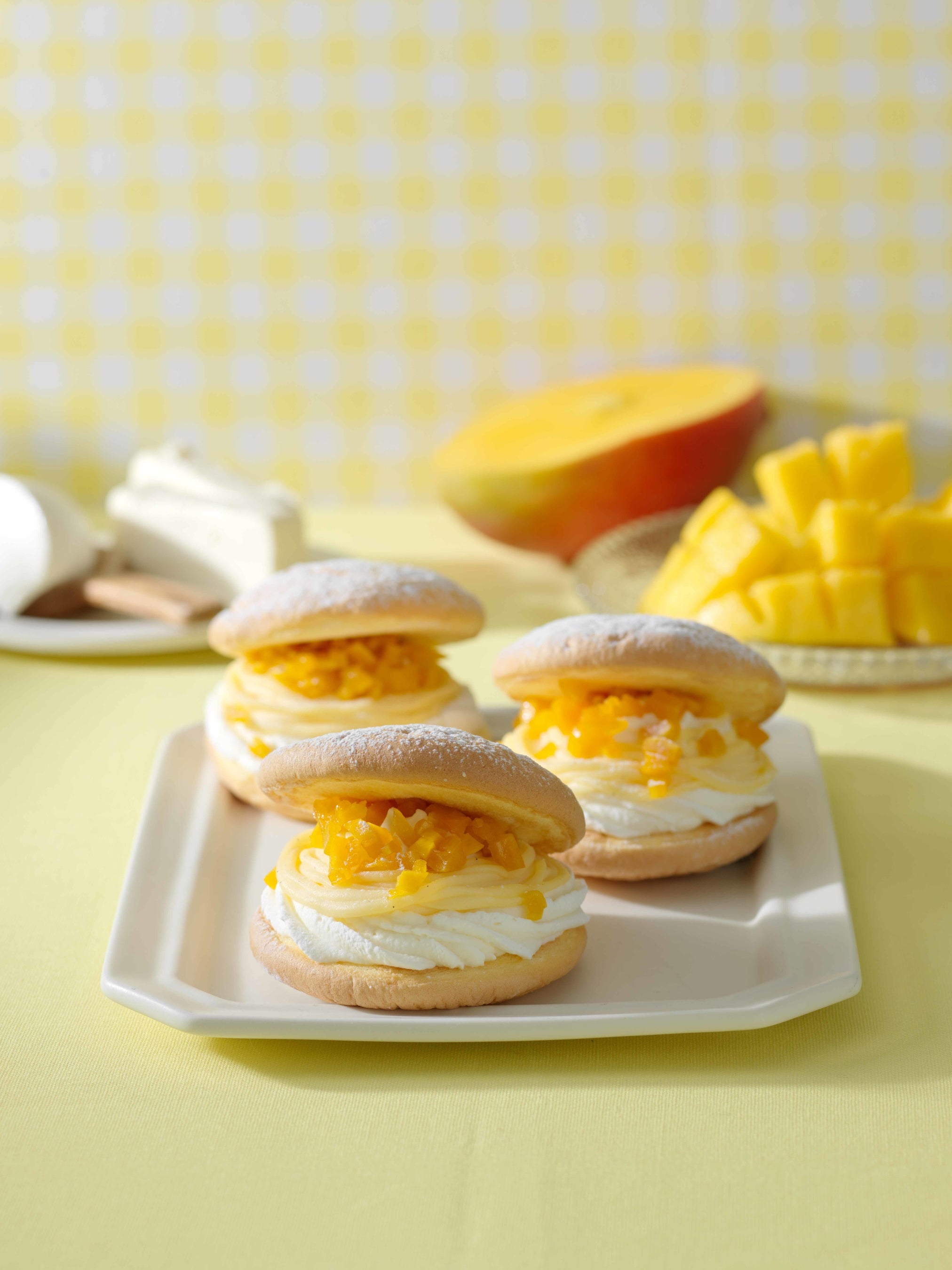 北海道産生クリーム、クリームチーズ、マスカルポーネチーズをブレンドした、あっさりとしたチーズ生クリームにカスタードクリームとマンゴーダイスをトッピングし、ふんわりやわらかい生ブッセ生地でサンド。