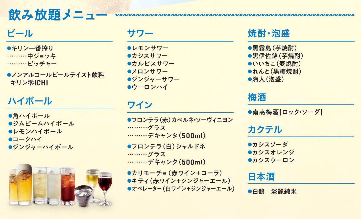 キリン一番搾りや角ハイもラインナップした豪華な飲み放題プランが120分990円!