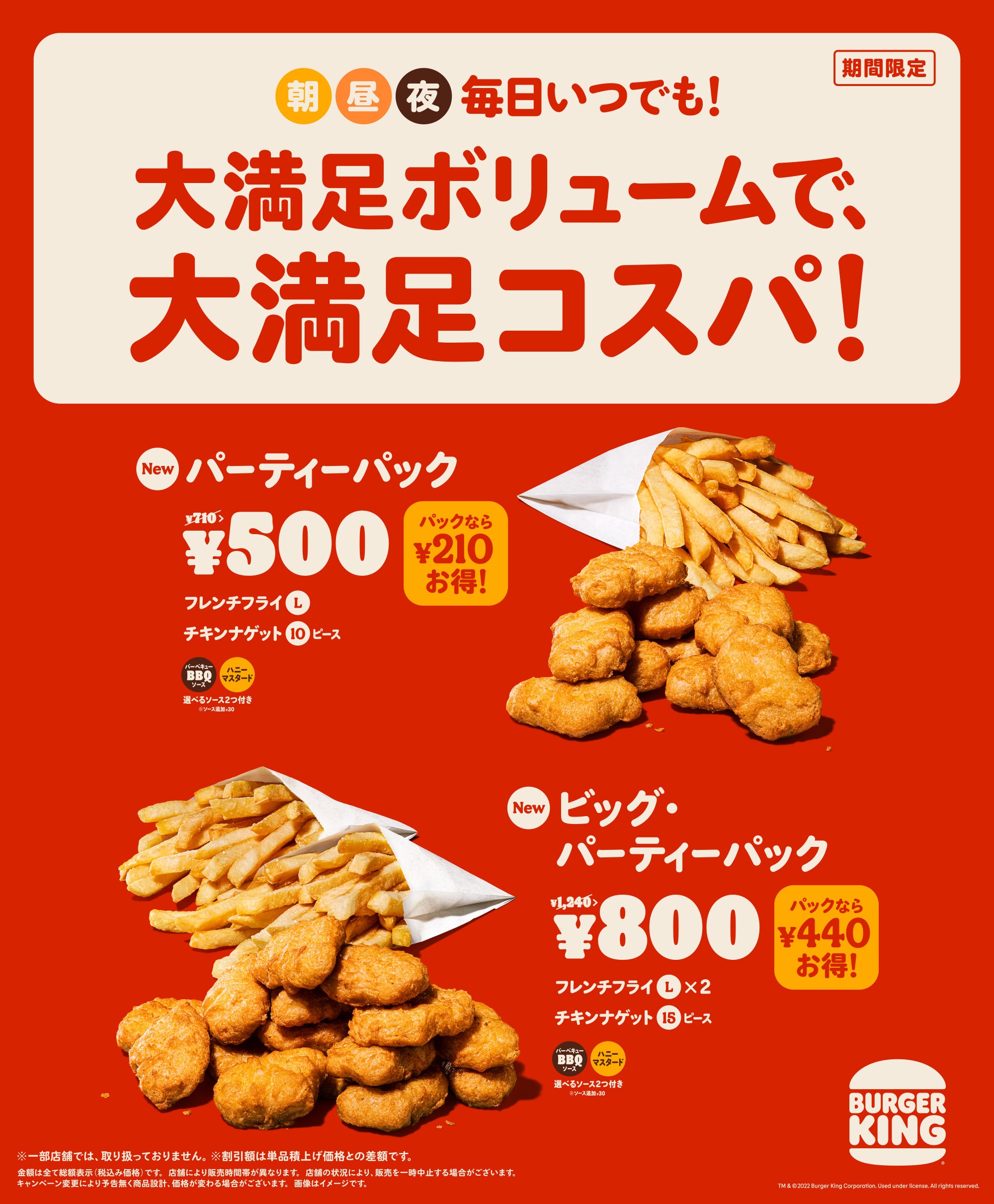 2022年5月27日(金)から、バーガーキング® の人気サイドメニューのフレンチフライとチキンナゲットがセットになった『パーティーパック』『ビッグ・パーティーパック』を期間限定で新発売いたします。