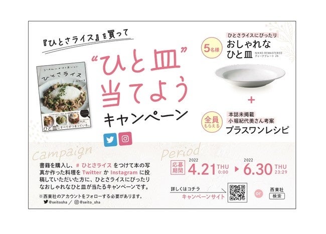 西東社のTwitterまたはInstagramをフォローし、「#西東社」「#ひとさライス」をつけて購入した書籍の書影を投稿するだけで応募完了。応募者のうち抽選で5名様に、ひとさライスの盛り付けにぴったりなディーププレートをプレゼントします。