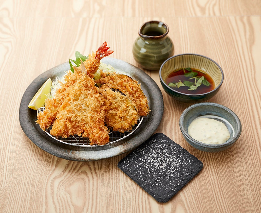 人気の海老フライと上品な味わいのキスフライ、夏野菜をカラッと揚げました。和風だし・タルタルソース・淡路島の藻塩で、味の変化をお楽しみください。