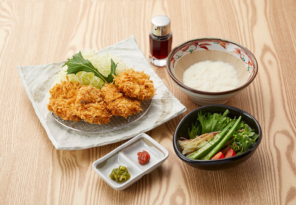 “北海道十勝産ネバリスター”を使用した山芋とろろに、牡蠣だし醤油や薬味をお好みで加えて、香味野菜をのせたヒレかつを絡めてお召し上がりください。上品でさっぱりとした味をお楽しみいただけます。