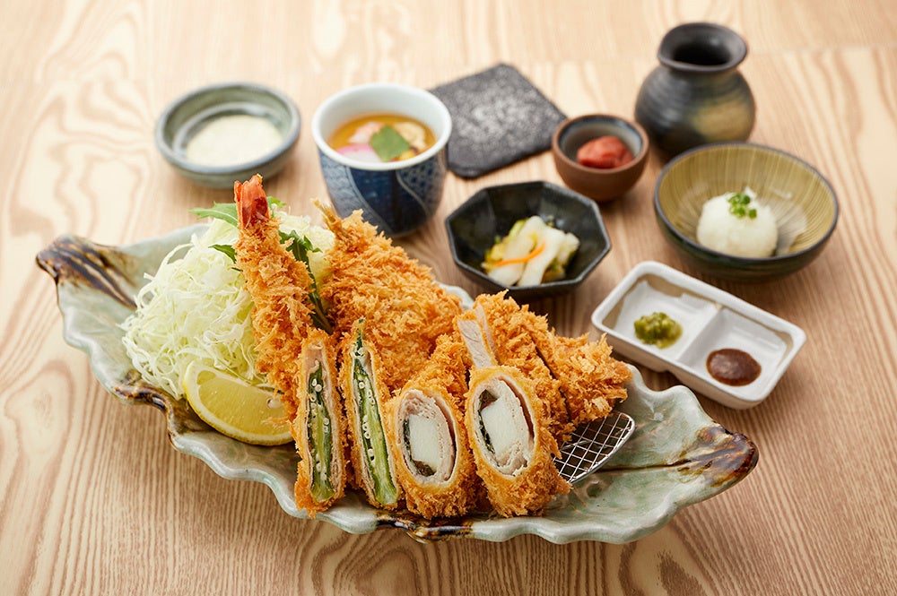 サクッとジューシーに揚げた六穀豚ロースかつをはじめ、“北海道十勝産ネバリスター”と梅しそを合わせた肉巻きかつ、オクラの肉巻きかつ、上品な味わいのキスフライ、海老フライなど、味のバラエティが存分に楽しめる贅沢な御膳です。発酵えごま味噌など、薬味ひとつにまでこだわっています。薬味はお好みで六穀豚ロースかつやご飯につけてお召し上がりください。