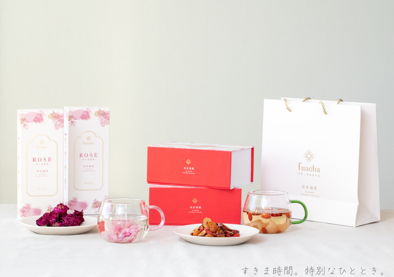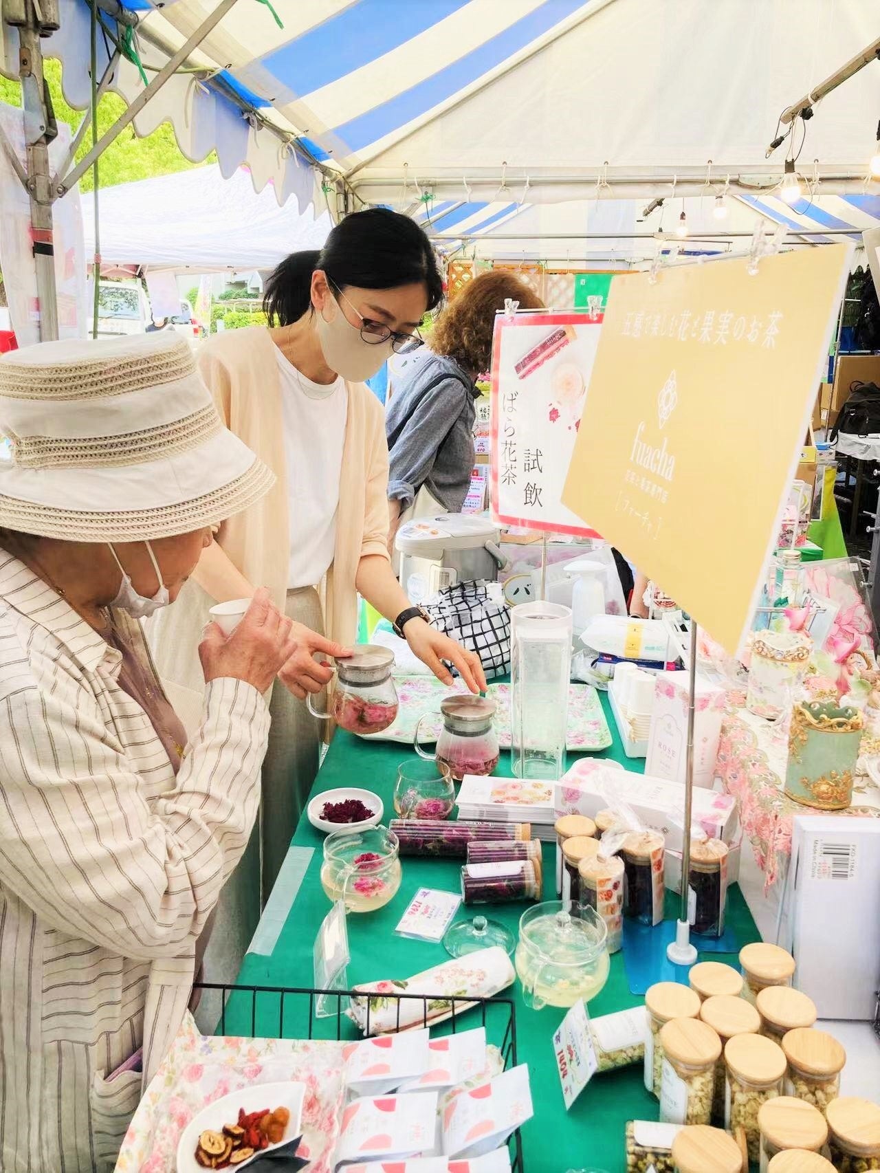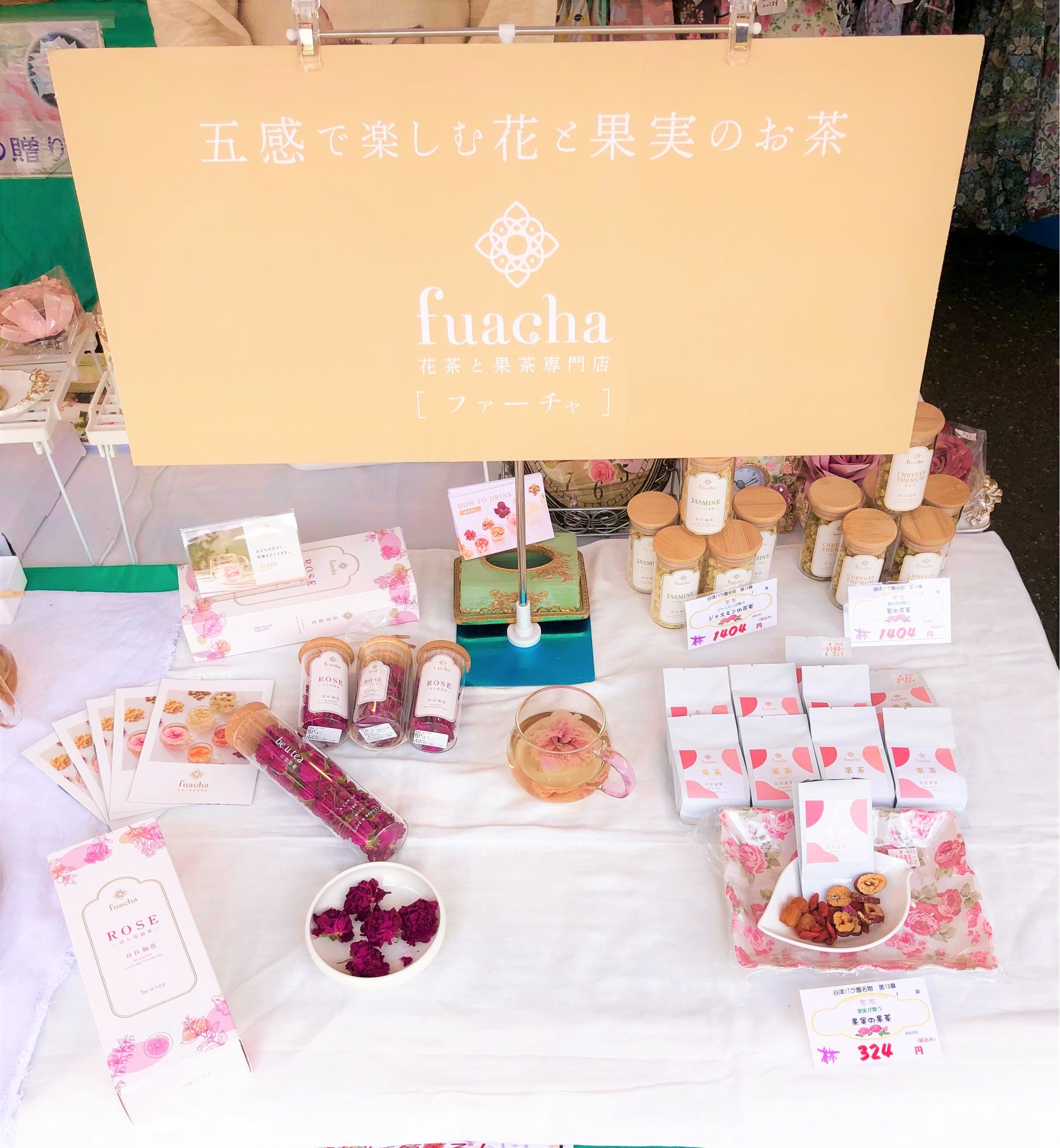 満開のバラを楽しんだ後は、バラにちなんだものを販売している特設会場にお寄りください。数々のバラグッズと一緒に、fuachaのコーナーでは「ばら花冠茶」「ジャスミン花茶」「菊花茶」の3種類を販売しています。