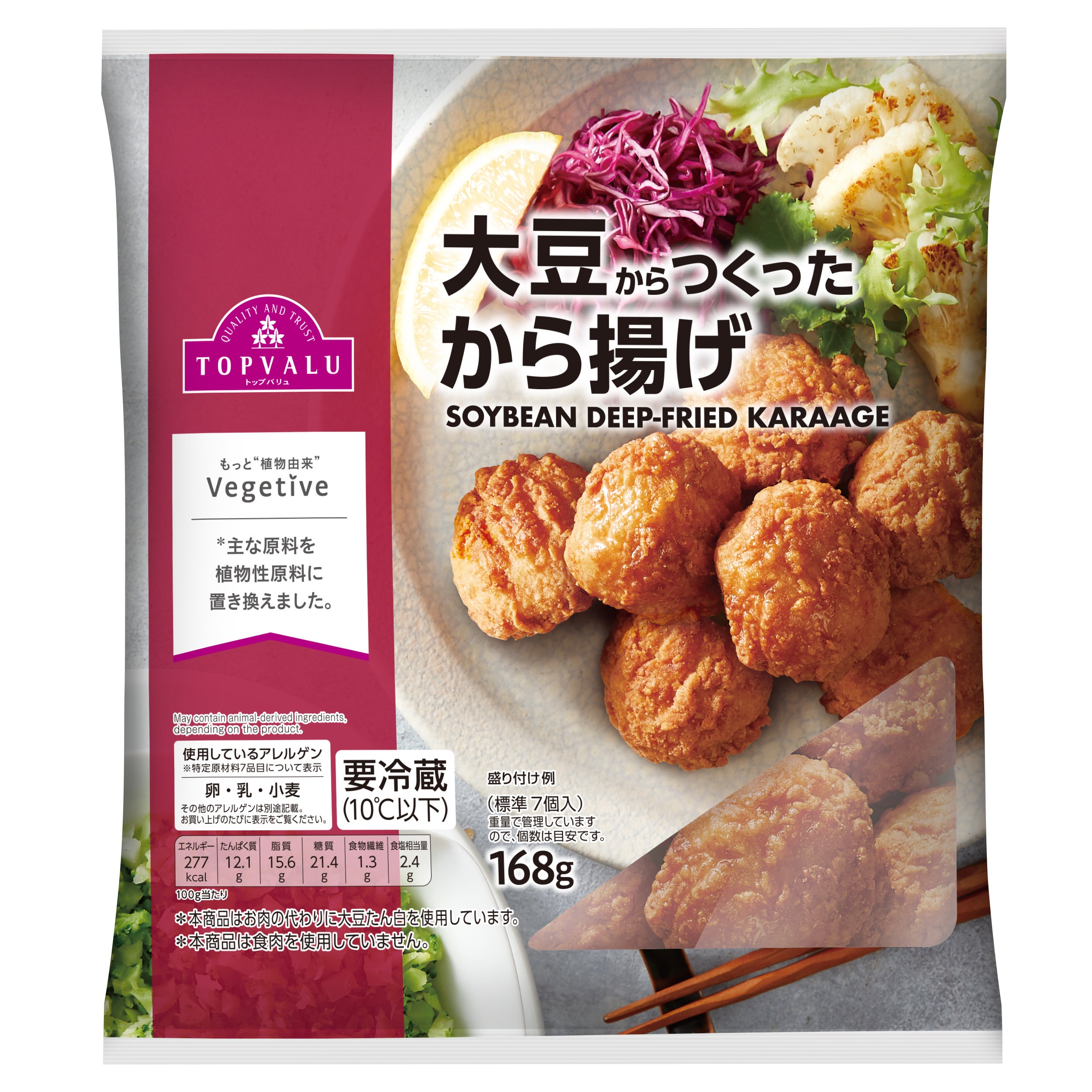 イオンは5月26日(木)より順次※1)、全国の「イオン」「イオンスタイル」「マックスバリュ」「KOHYO」等、グループ約2,000店舗※2にて、“ヘルシーとおいしいをどちらも叶える新しい食のカタチ”を提案する植物代替食品シリーズ「トップバリュ Vegetive(ベジティブ)」シリーズ(以下、ベジティブシリーズ)から、大豆からつくったから揚げやハムカツ風など5品目を発売※2)します。