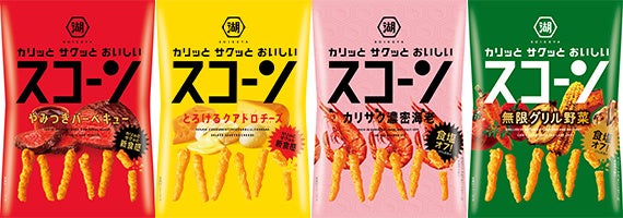 「スコーン」は、35年目のモデルチェンジと銘打ち、本格的かつ濃厚でやみつきな味わいはそのままに、生地の食感、味付け、パッケージすべての側面で、2022年3月に新たに生まれ変わりました。“カリッとサクッとおいしい”への原点回帰を図り、より現代で支持されるような口溶けの良い生地に進化。生地、食感の変化に合わせ、濃厚なのに後切れの良い味付けに改良し、かる~い軽快なおいしさに磨き上げました。
