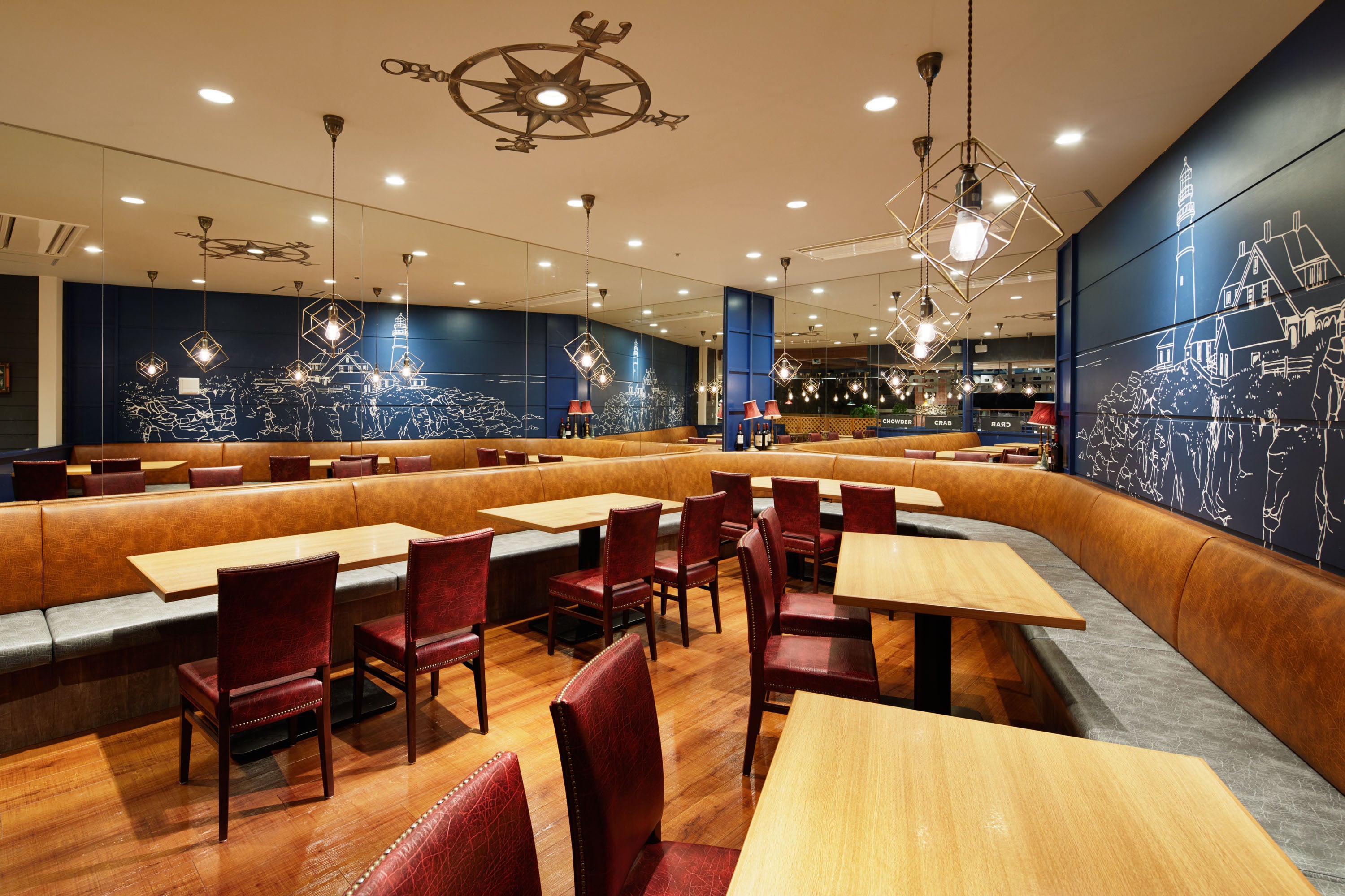 灯台の壁画が象徴的な空間。ライトのデザインも特徴的です。