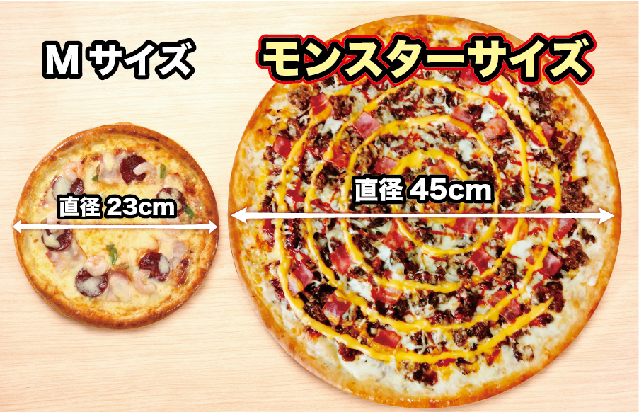 “北海道ビーフピザバーガー”は3つのサイズが選べます。基本のMサイズ、満腹のLサイズまでがスタンダードですが、その上には「日本最大級!?超巨大モンスターサイズ」が!!