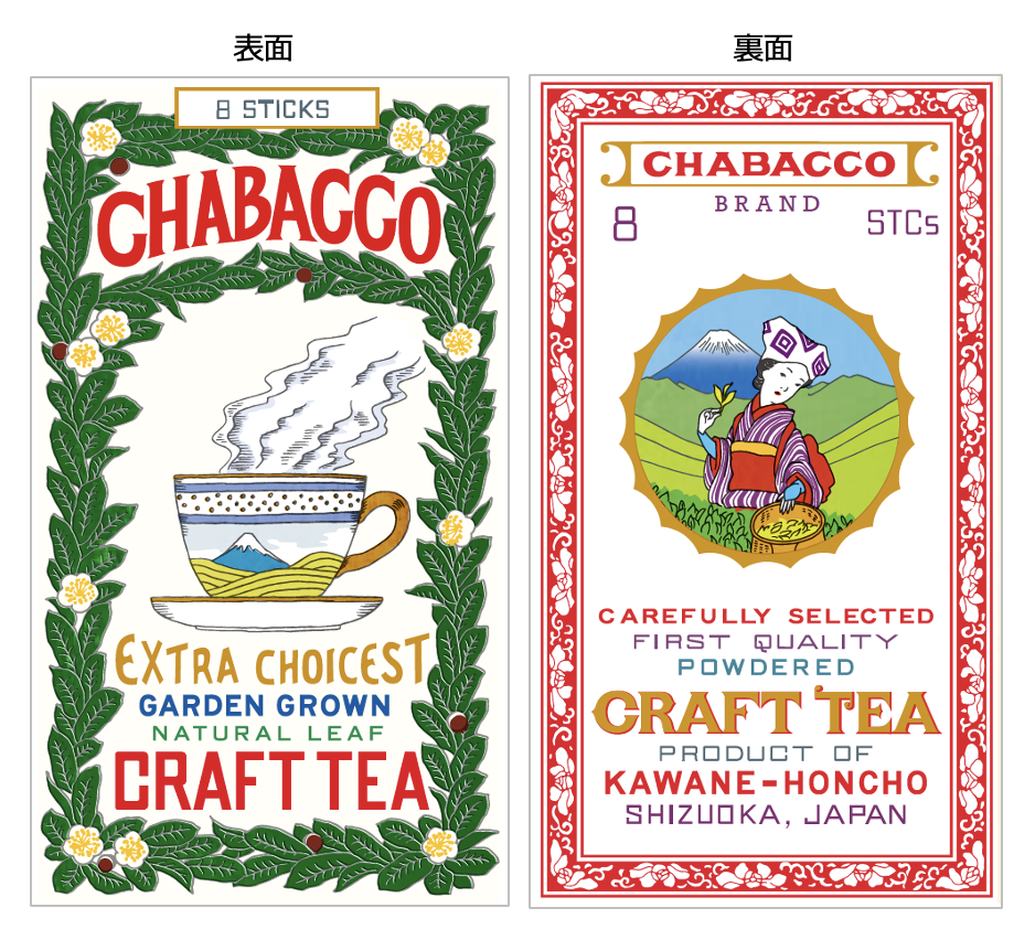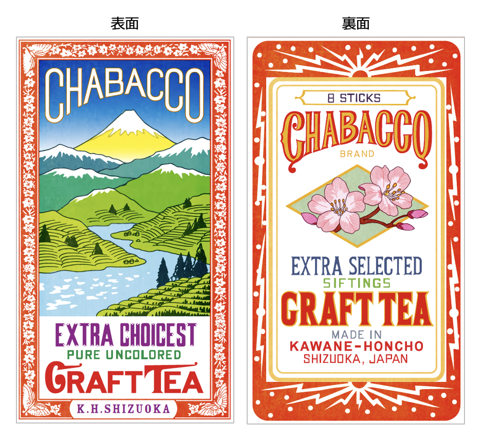 お茶産業の活性化を目指す当社は、蘭字を模したこの新しいChabaccoのデザインに、お茶産業の急成長を再度実現したいという思いを込めました。デザインには、当社が本社を構える静岡県屈指の茶産地「川根本町」の風景等をあしらっています。日本人観光客だけでなく、これから増加するであろう海外からの観光客のみなさんにも静岡茶を親しんでもらえるよう、蘭字を模したデザインのChabaccoの販売を開始します。