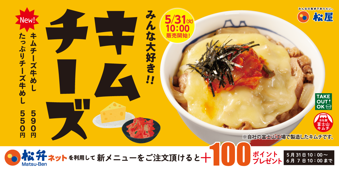 5月31日10時~6月7日10時まで、松弁ネットを利用してチーズ牛めし・キムチーズ牛めしをご注文頂けると、100ポイントプレゼントいたします。