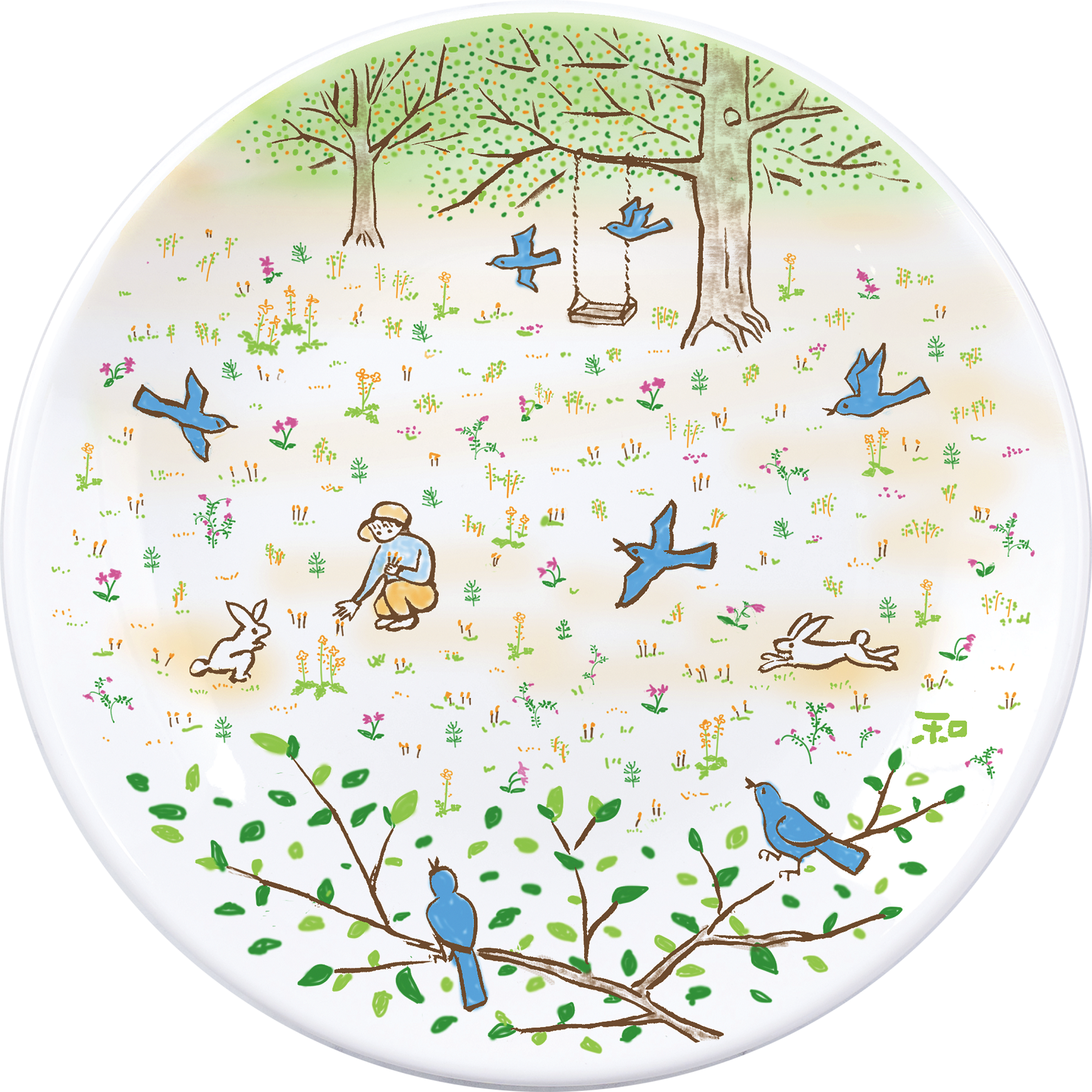 税込2,000円以上の店内ご飲食で、ご希望のお客さまに、陶芸家 市川和美デザイン絵皿「小鳥と少年の春色皿」1枚(直径約15cm)をプレゼントいたします。