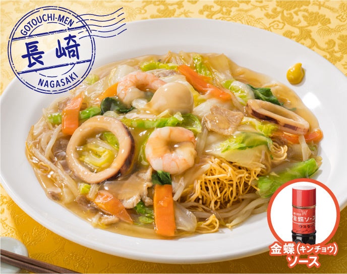 パリパリ麺に、海老やイカが入った具沢山とろ〜りあんかけをたっぷりと。お好みで、長崎生まれのウスターソース「金蝶ソース」やお酢、からしを加えて“味変”をお楽しみください。