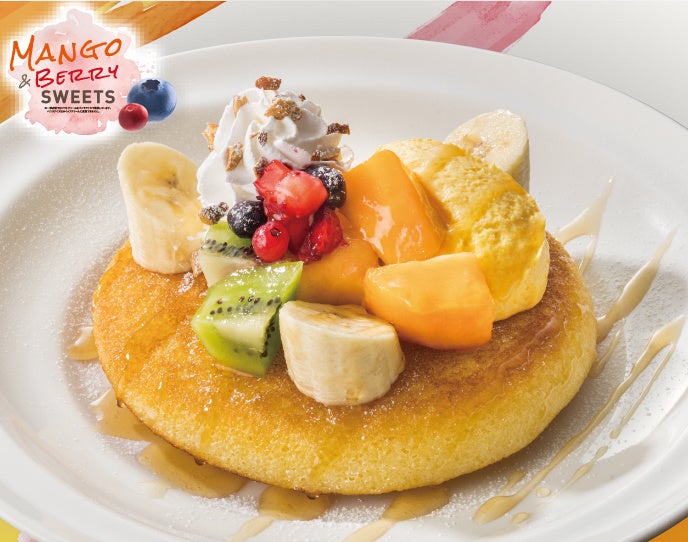 ふわふわに仕上げたパンケーキに、マンゴークリームとフルーツをふんだんにあしらったボリュームたっぷりの一皿。