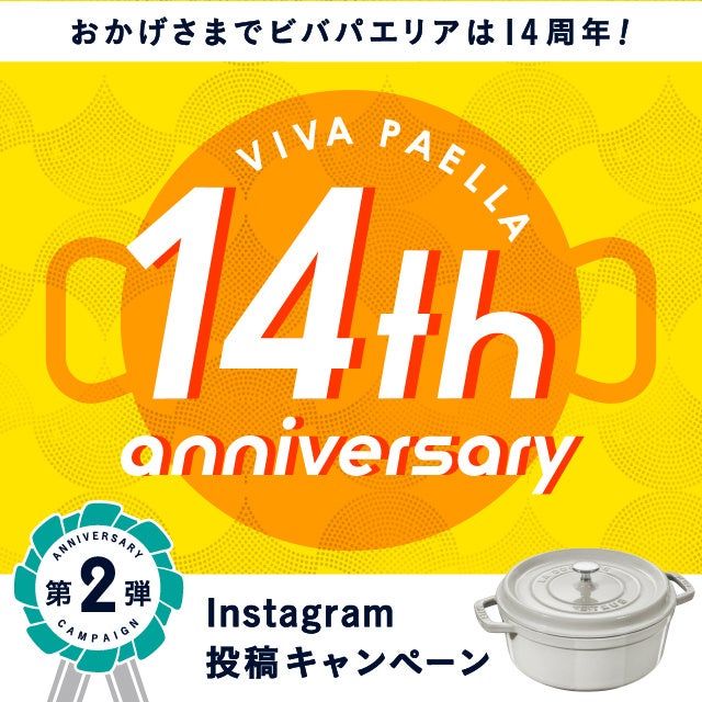14周年記念企画の第二弾となる今回は 「Instagram投稿キャンペーン」を開催。ビバパエリアと一緒に楽しみたい、あなたが作ったタパス(小皿料理)の写真を簡単なレシピと一緒にInstagramに投稿し、選ばれた方には素敵な豪華賞品を!おしゃれなストウブのココットや大人気のテーブルグリル、ビバパエリアで使えるチケットなど合計14名様にプレゼントします。
