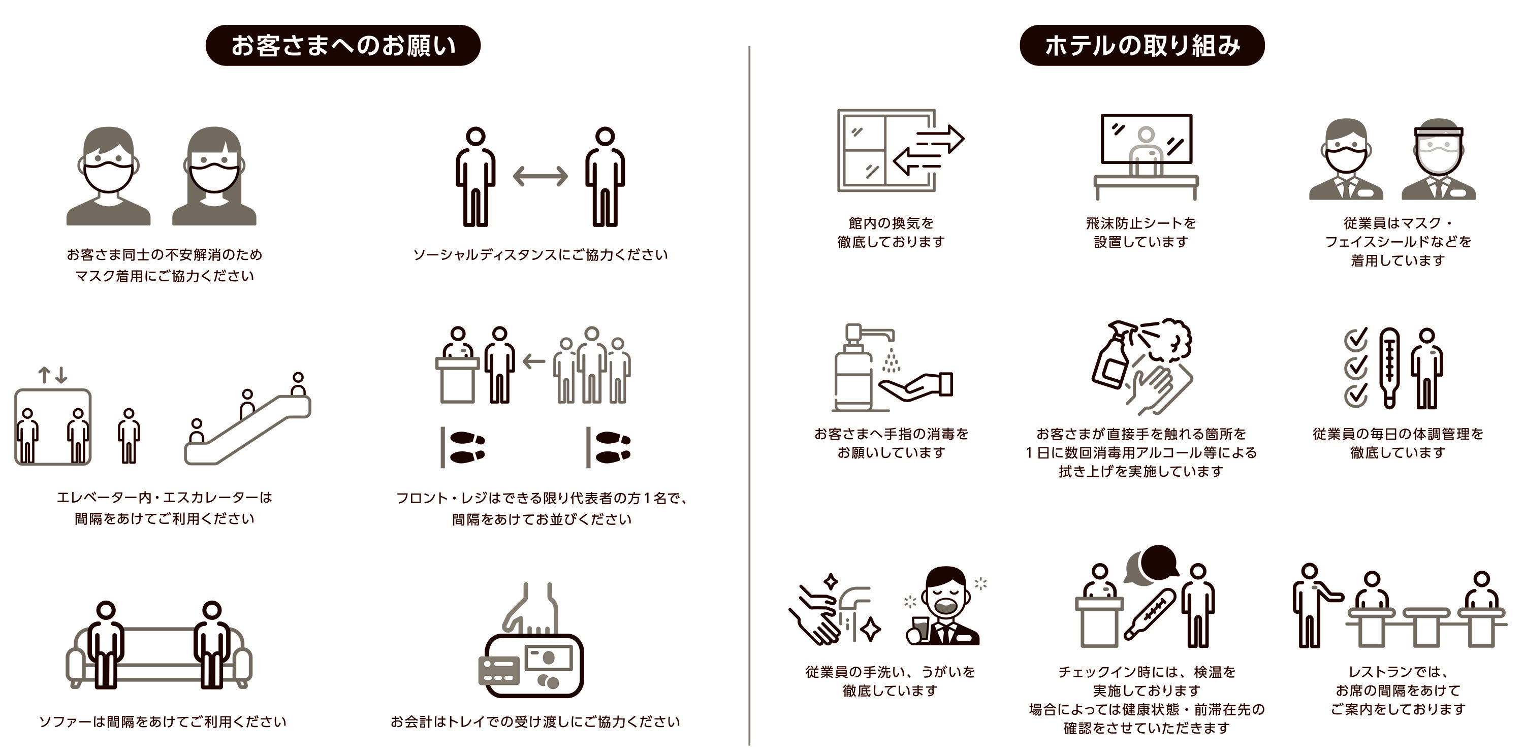 金沢東急ホテルではお客さま・従業員の安全・安心を最優先に考え、各種ガイドラインに基づいた対策を策定し、取り組んでおります。