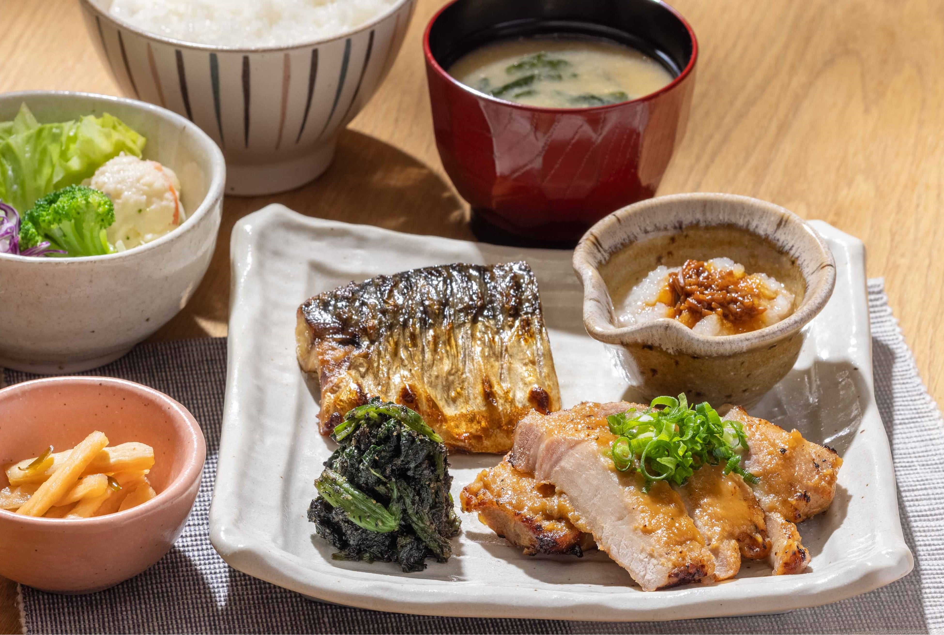 - ごはん処定食 豚ロースの味噌漬けさばの炭火焼き 【NEW】