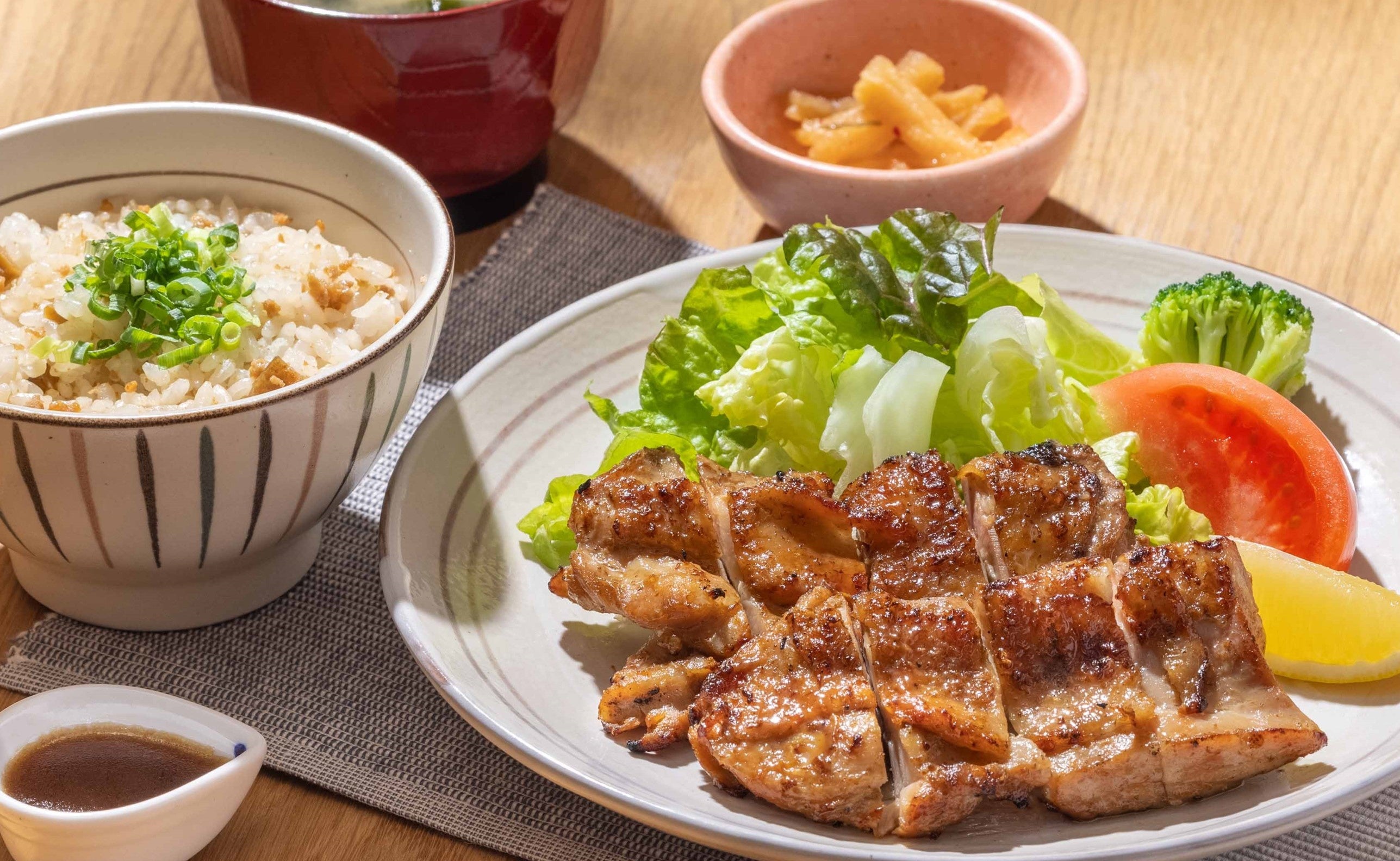 じっくり焼いたもろみチキンと、生姜の香りとごぼうの食感がたまらない混ぜご飯のセットです。
