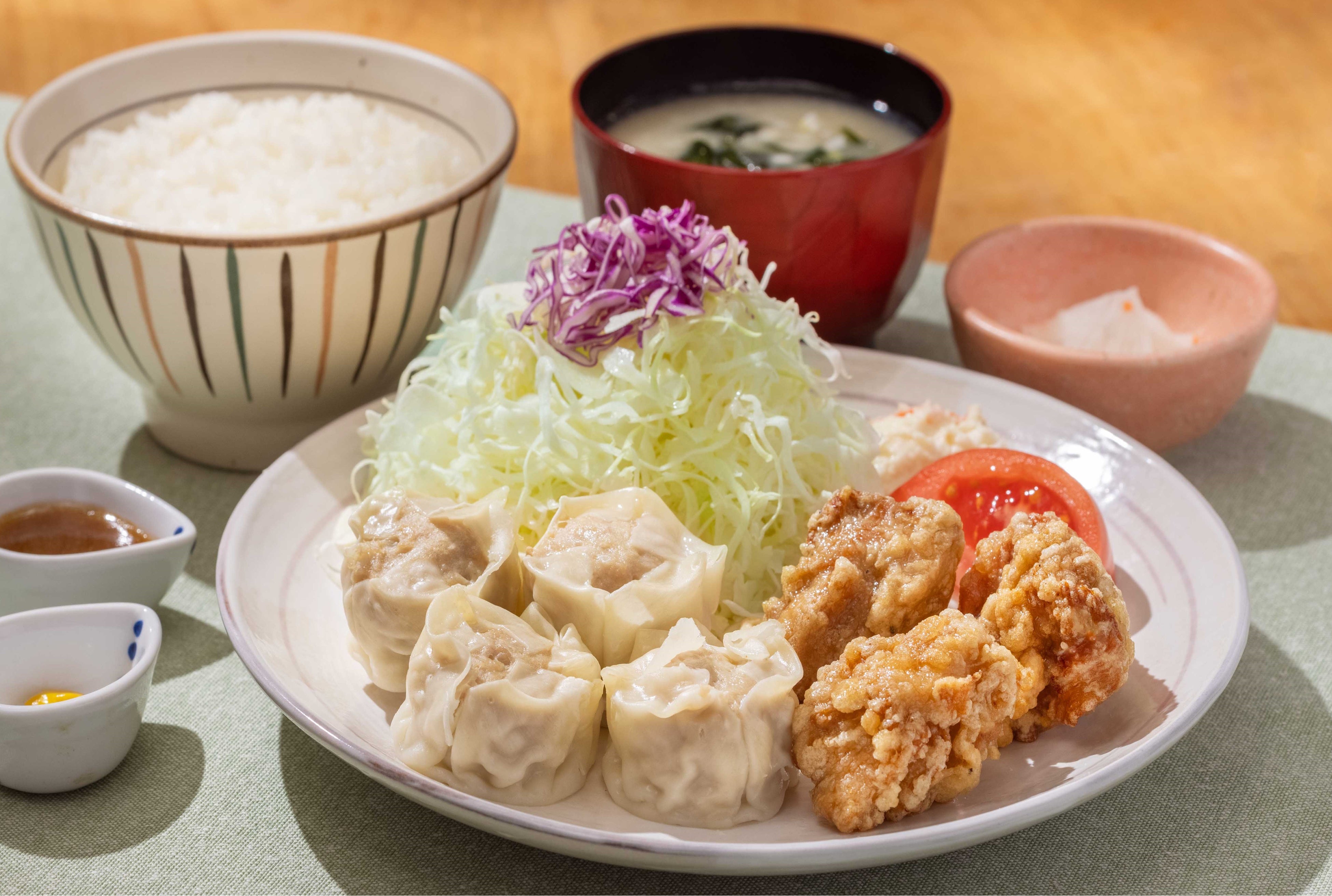 食べごたえのあるシューマイと大戸屋自慢のジューシーな唐揚げがセットになった合い盛り定食です。