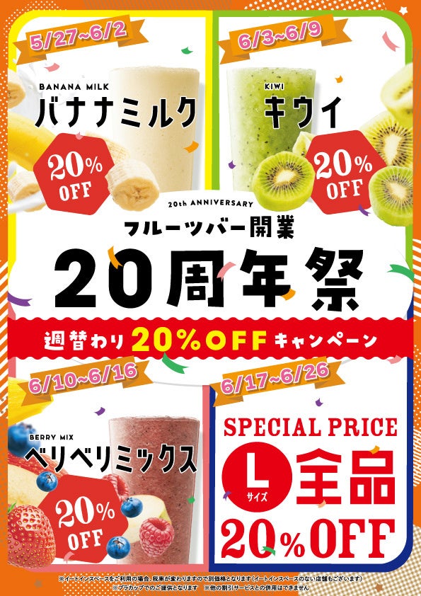 20周年の「20」にちなみ、年間を通して人気No.1商品の「バナナミルク」をはじめ、開業当時から変わらず愛され続ける「キウイ」や「ベリベリミックス」が週替わりで20%お得にお楽しみいただけます。最後の週には、暑い夏に向けて水分やビタミン補給にぴったりのLサイズ全品がお得にお買い求めいただけます。