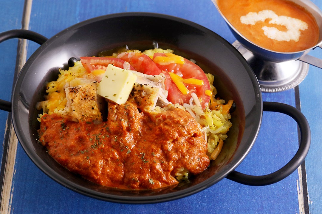 マイルドなバターチキンカレーとスパイシーなキーマカレー、2種類のカレーをそれぞれたっぷりとオンした特製パエリアをご用意いたしました。
