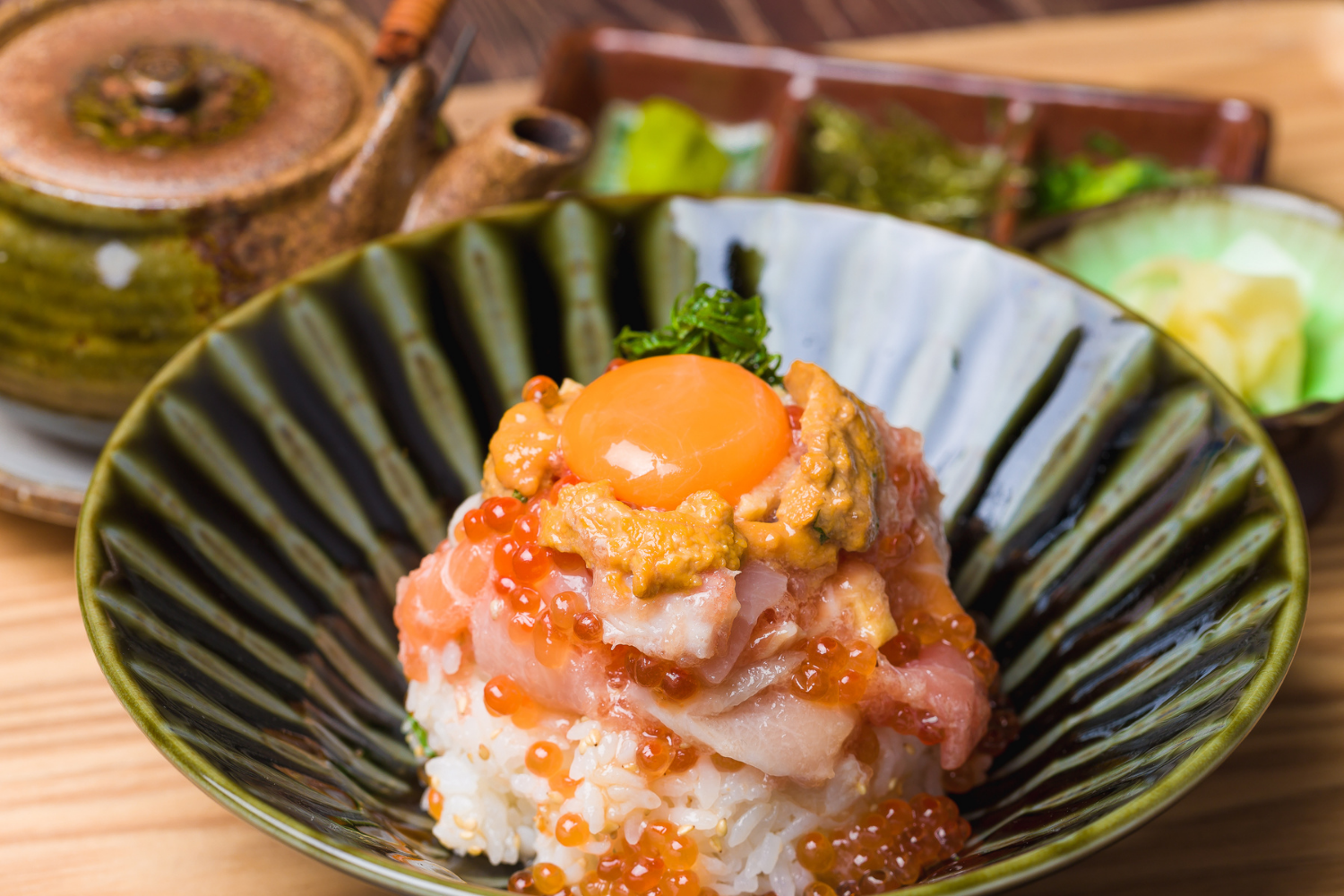 また、味変で3度楽しめることも魅力のひとつです。まずはそのままお召し上がりいただき、続いてたまごを絡めて全体をまろやかに。最後は特製のお出汁をかけて「海鮮出汁茶漬け」で〆てください!わさびや薬味もお好みで。