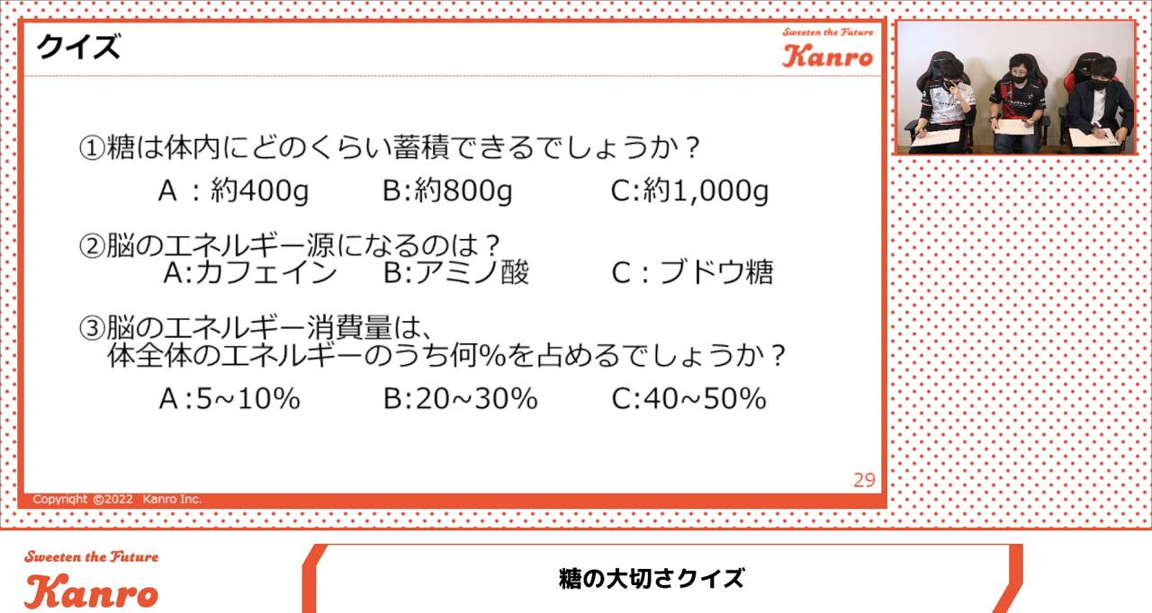 カンロ飴やピュレグミなどでおなじみのカンロ株式会社(本社:東京都新宿区、代表取締役社長 三須 和泰、以下 カンロ)は、プロeスポーツチームである「忍ism Gaming」を運営する株式会社忍ism(東京都豊島区、代表取締役社長 百地 祐輔 以下 忍ism)と「糖×eスポーツ」をテーマにしたオンラインセミナーを5月17日(火)に開催しました。