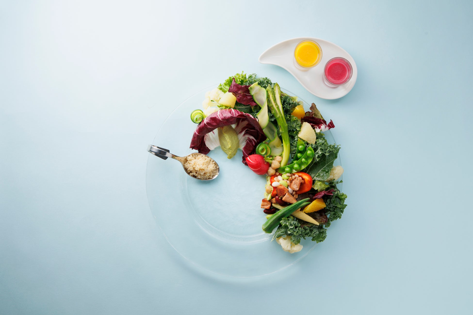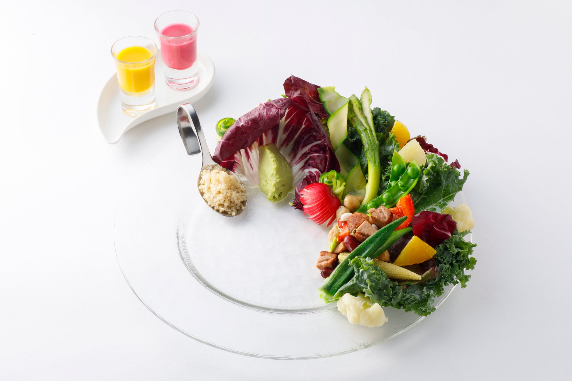「大豆ミートとひよこ豆の彩りサラダ」は、オクラやアスパラなど10種以上の野菜を使用しています。色鮮やかな緑色が目を引くグリーンピースピューレを加えたフムスがアクセント。滑らかな口触りの広がりをお楽しみいただけます。その他、キヌアやフルーツをのせており、自家製ドレッシングはビーツと人参の2種。ビーツドレッシングはビーツ独特の甘味と酸味があり、これから蒸し暑くなり食欲が落ちる季節でもさっぱりと食べられます。食べ応えを出すためのアクセントとして、お肉ではなく大豆ミートを使用することで、罪悪感なくお召しあがりいただけます。
