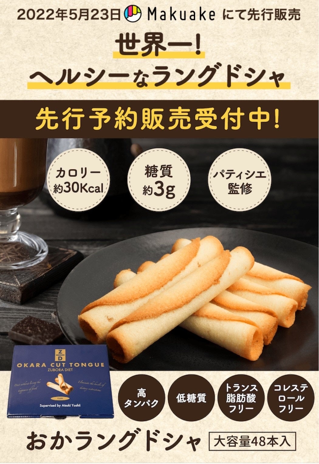 いつもの食事を変えるだけをコンセプトにしたダイエット食品ブランド「ZUBORA DIET(ズボラダイエット)」が、昨日5月23日クラウドファンディングサイト「Makuake」にて低カロリー・低糖質の巻ラングドシャ「おかラングドシャ」(https://www.makuake.com/project/zuboradiet/)を発表し同サイトにて先行販売を開始、わずか6時間で50万円を達成した。(5月26日時点で支援者数200名、総支援額は80万円を超えている)