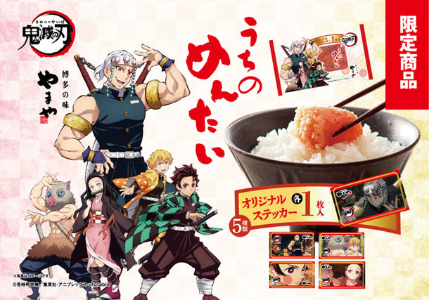 パッケージにはアニメ「鬼滅の刃」のキャラクター竈門炭治郎、竈門禰豆子、我妻善逸、嘴平伊之助、宇髄天元を採用。パッケージの中にはアニメの名場面をデザインした5種類のオリジナルステッカーのうち1種類がランダムで入っており、思わず集めたくなる仕掛けになっております。アニメ鬼滅の刃の特別パッケージとともに、やまやのご家庭用明太子をお楽しみください。