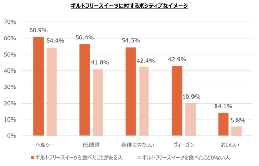 ギルトフリースイーツに対する印象を伺ったところ、ヘルシーや低糖質、身体にやさしい等といったようにポジティブな意見が過半数を超えていることが分かりました。一方、ネガティブなイメージも見られ、「食べたことがある人」と「食べたことがない人」とでは「味が薄い」というイメージでは15.4%も差が開く結果となりました。