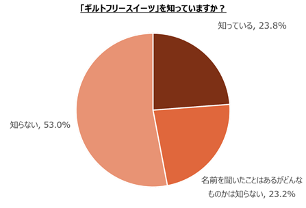 「名前を聞いたことはあるがどんなものかは知らない人」は23.2%といったように、「ギルトフリースイーツ」はまだまだ浸透していないことが伺えます。