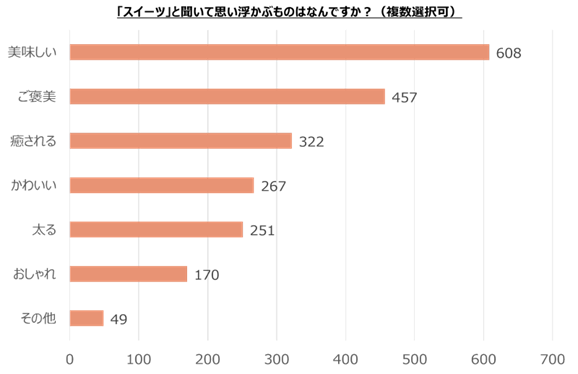 多くの人が「スイーツ」に対して、おいしい、ご褒美といったポジティブなイメージを抱いている一方、”太る”といったネガティブな声も伺えました。