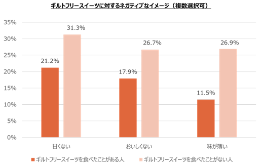 ◆ギルトフリースイーツを「食べたことがある人」は「食べたことがない人」と比べ、『味が薄い』などのネガティブイメージが15.4%も低い結果に!