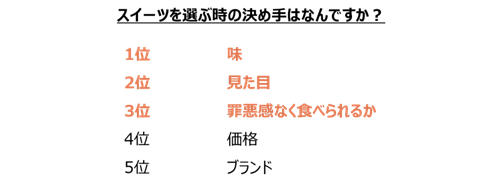 ◆スイーツ選びの決め手は「味」「見た目」に続いて、「罪悪感なく食べられるか」が3位にランクイン