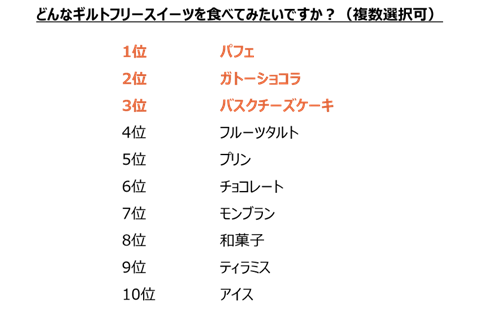 ◆「食べてみたいギルトフリースイーツ」第1位はスイーツ好きの定番「パフェ」!続いて、「ガトーショコラ」「バスクチーズケーキ」と濃厚な味わいが特徴のスイーツがランクイン。