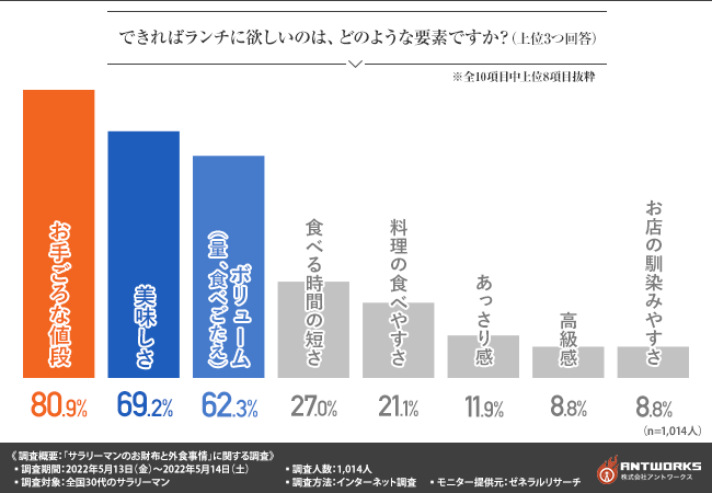 ただ、美味しさやボリュームにも多くの回答が寄せられたことから、「安く、美味しく、お腹一杯食べられる」ランチを求めているといえるでしょう。