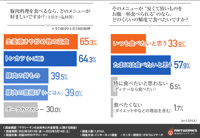 「豚肉料理を食べるなら、どのメニューが好ましいですか?(上位3つ迄)」と質問したところ、『生姜焼きや炒め物の定食(65.3%)』と回答した方が最も多く、次いで『トンカツ(+ご飯)(64.3%)』『豚肉の丼もの(39.5%)』『豚肉の唐揚げ(+ご飯)(39.0%)』『ポークカツカレー(30.0%)』と続きました。