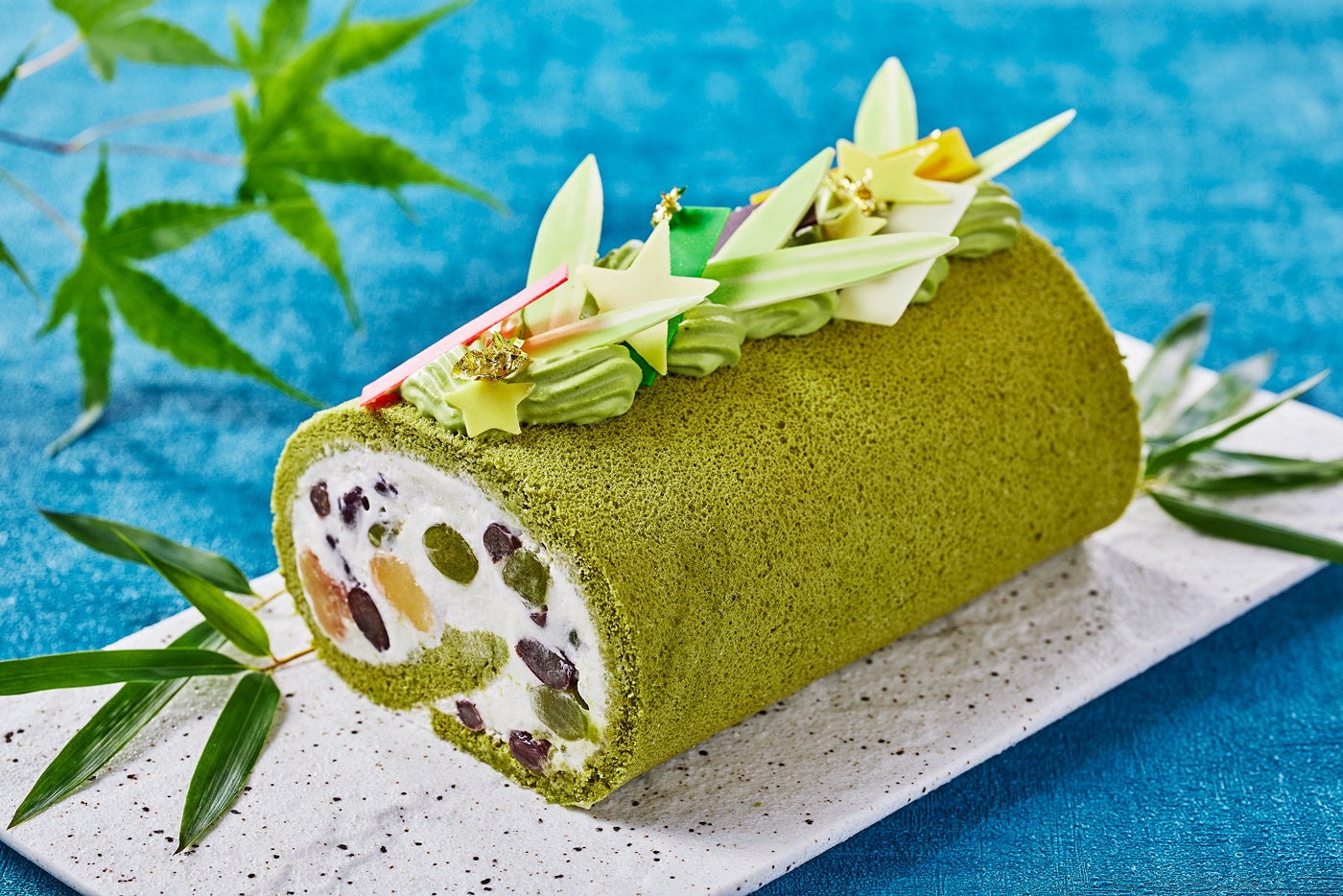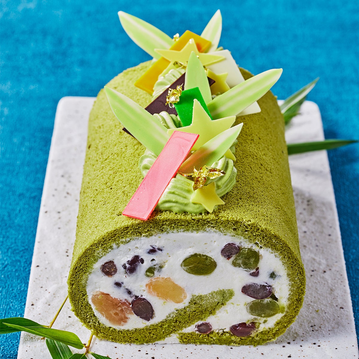 竹をイメージした抹茶のスポンジで、夜空に輝く星をイメージした5種のかのこ豆と生クリームを包み、五行説にちなんだ五色の短冊をかたどったチョコレートをあしらいました。