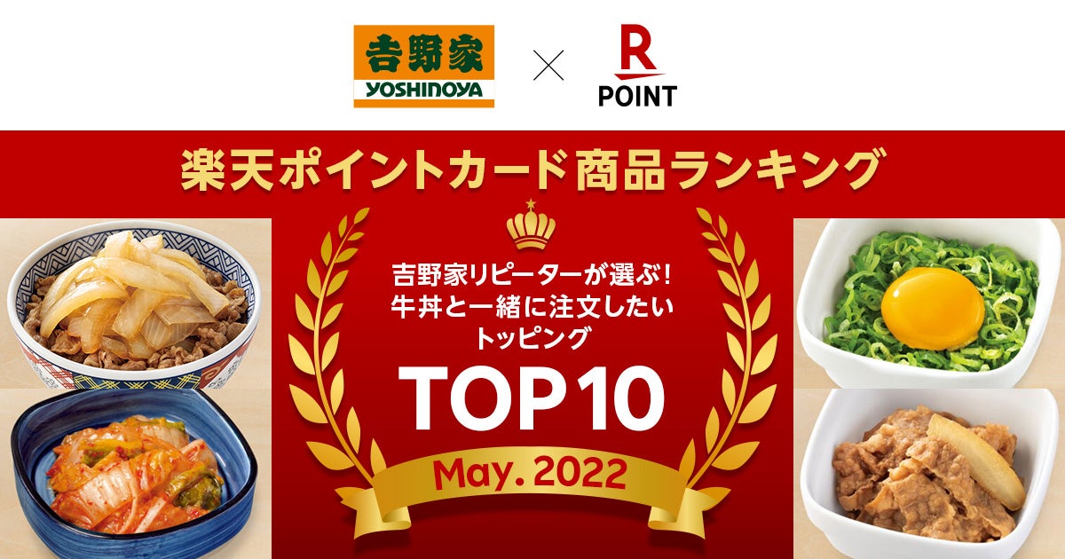 株式会社吉野家(本社:東京都中央区、代表取締役社長:河村 泰貴、以下 吉野家)と楽天ペイメント株式会社(本社:東京都港区、代表取締役社長:中村 晃一、以下 楽天ペイメント)は共同で、「楽天ポイントカード商品ランキング」において「吉野家リピーターが選ぶ!牛丼と一緒に注文したいトッピングTOP10!」を発表しました。