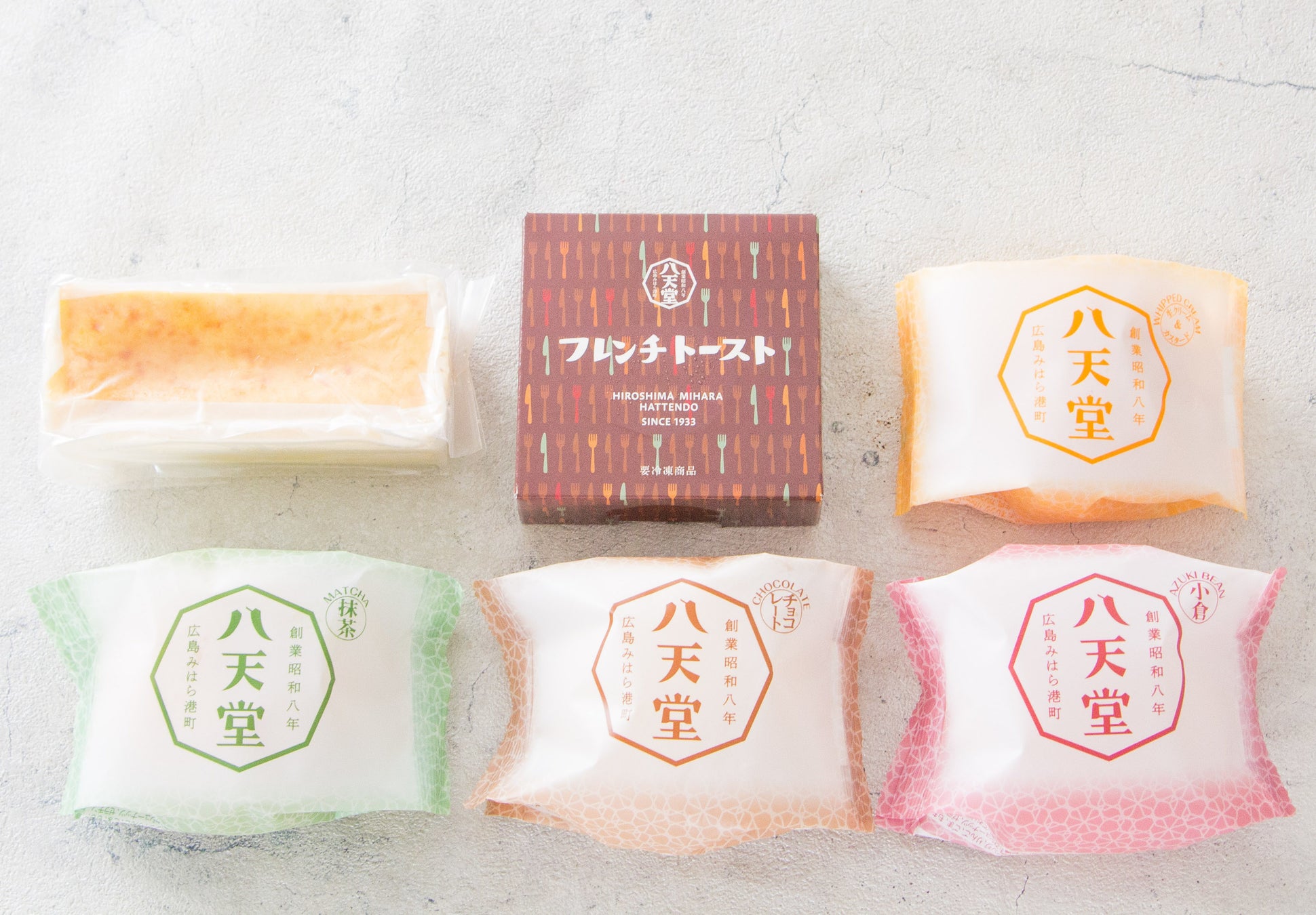 八天堂「フレンチトースト」、「くりーむパン」生クリーム&カスタード、「くりーむパン」抹茶、「くりーむパン」チョコレート、「くりーむパン」小倉
