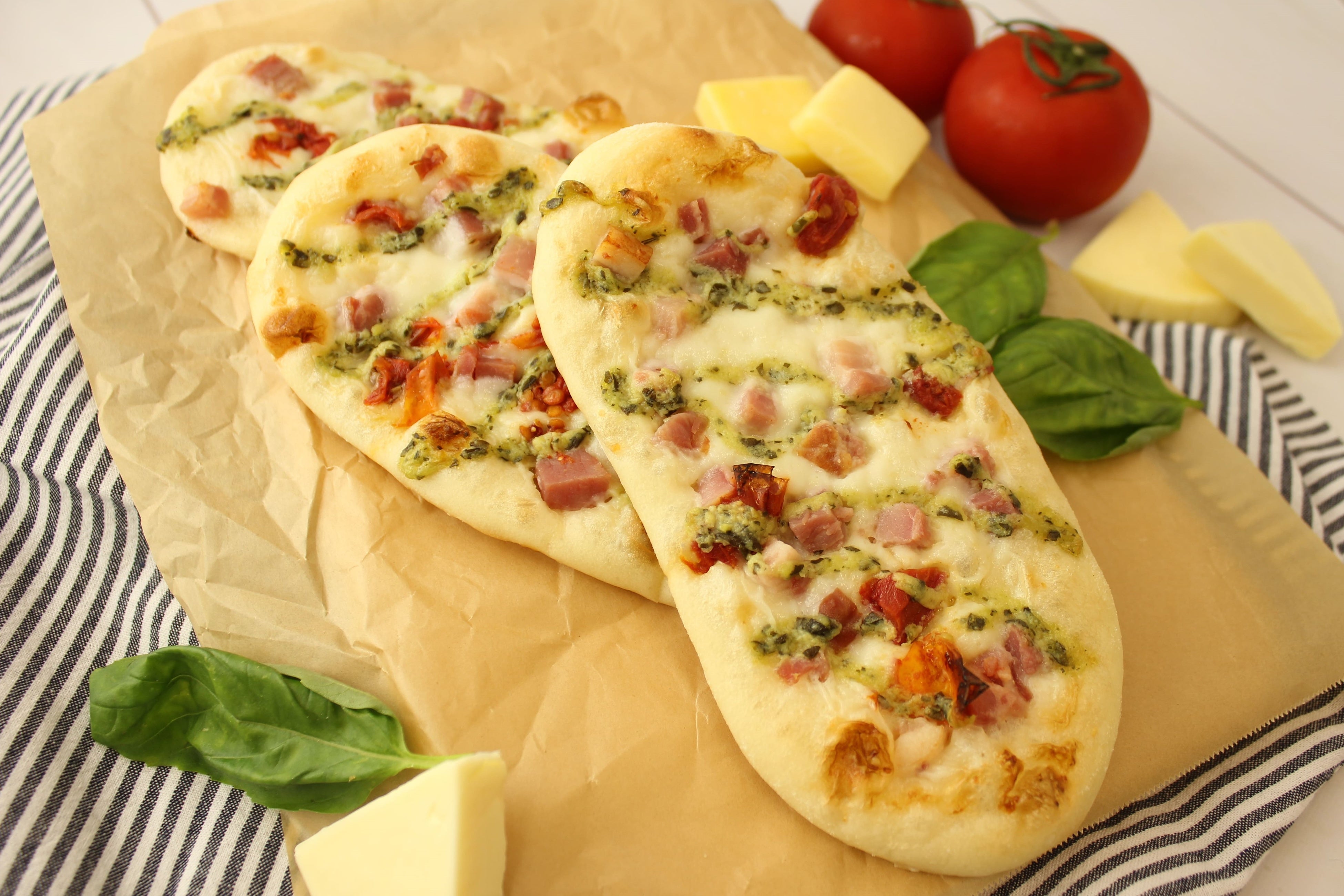 フォカッチャ生地に、チーズとじゃがいもを混ぜたアリゴ風ソース、ベーコン、セミドライトマトをトッピング。