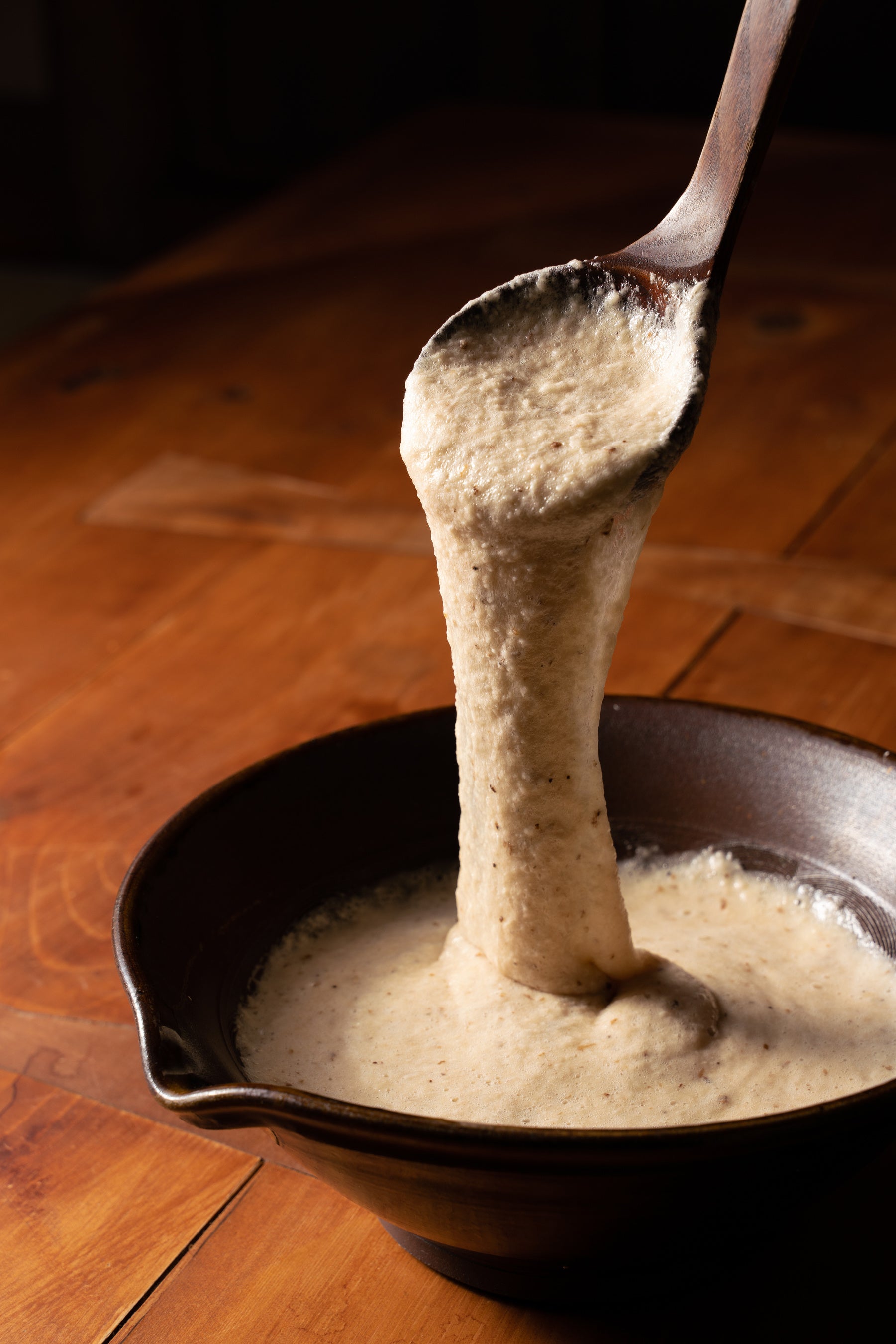 国産小麦を100%使用し自然薯を黄金比率で配合した自社製麺「自然薯うどん」に指宿産鰹節 本枯れ節から取った出汁で摺り上げる筥崎とろろの「自然薯とろろ」をかけ本枯れ節を添えて仕上げました。